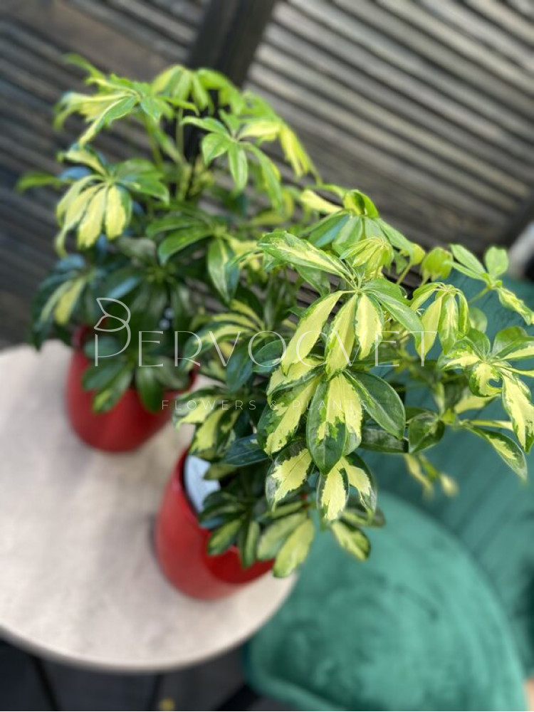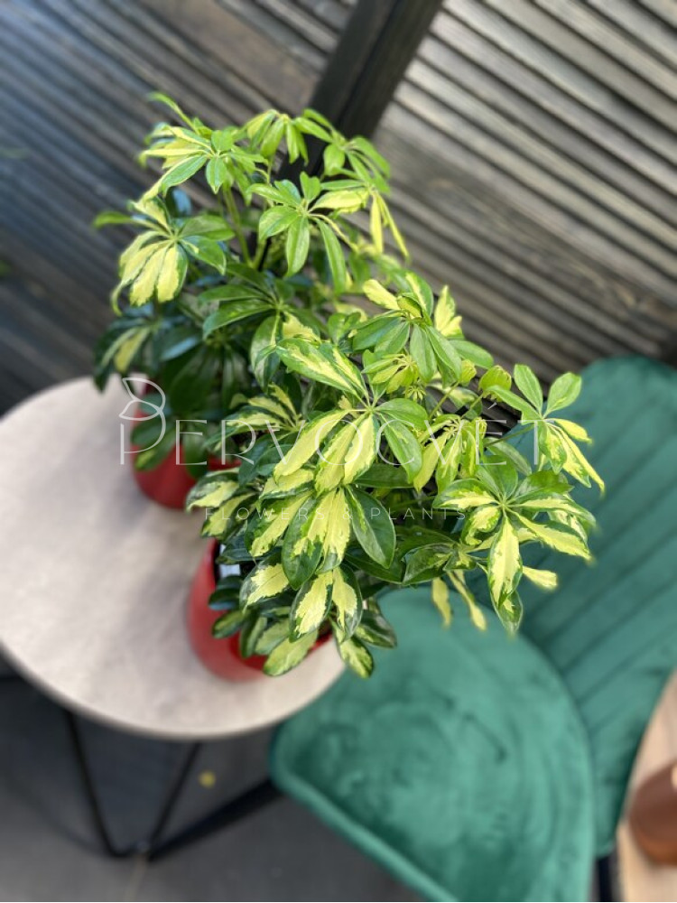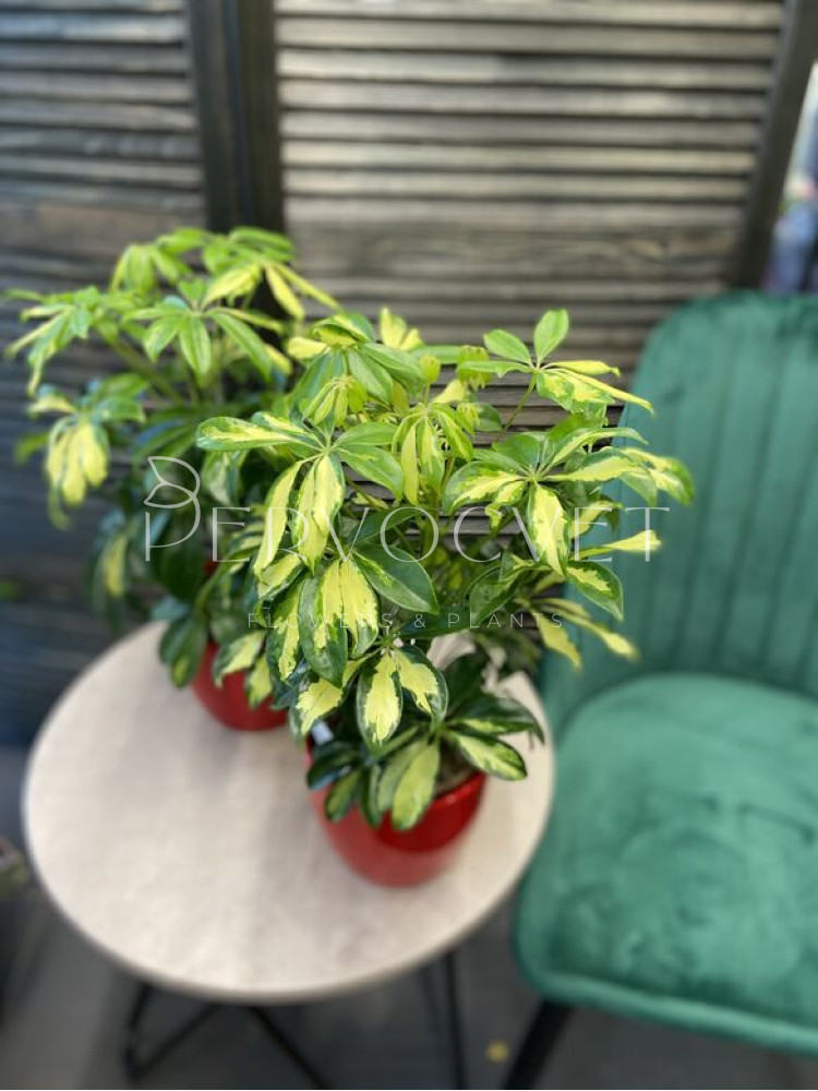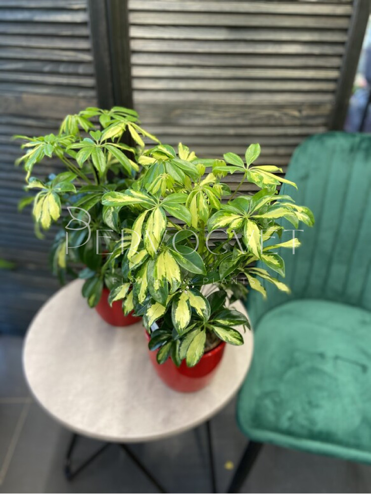 Шеффлера - культурная форма древовидных Шеффлер, которые произрастают в тропическом поясе. Максимальная высота домашнего растения 120 см. Цветения в домашних условиях не происходит, ценность представляет "зонтичная", сочная, двухцветная листва. При этом растение неприхотливо и легко в выращивании.