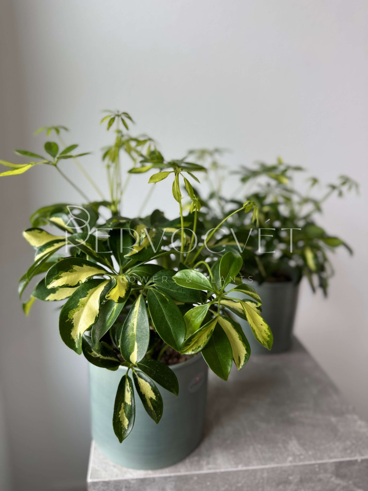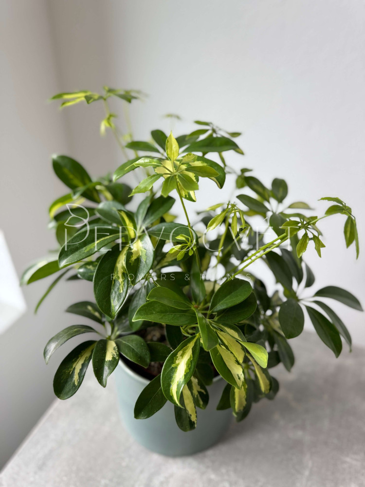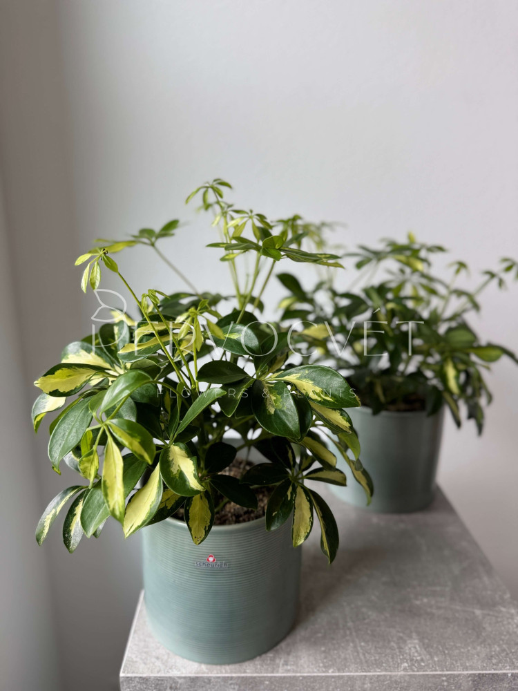Шеффлера - культурная форма древовидных Шеффлер, которые произрастают в тропическом поясе. Максимальная высота домашнего растения 120 см. Цветения в домашних условиях не происходит, ценность представляет "зонтичная", сочная, двухцветная листва. При этом растение неприхотливо и легко в выращивании.