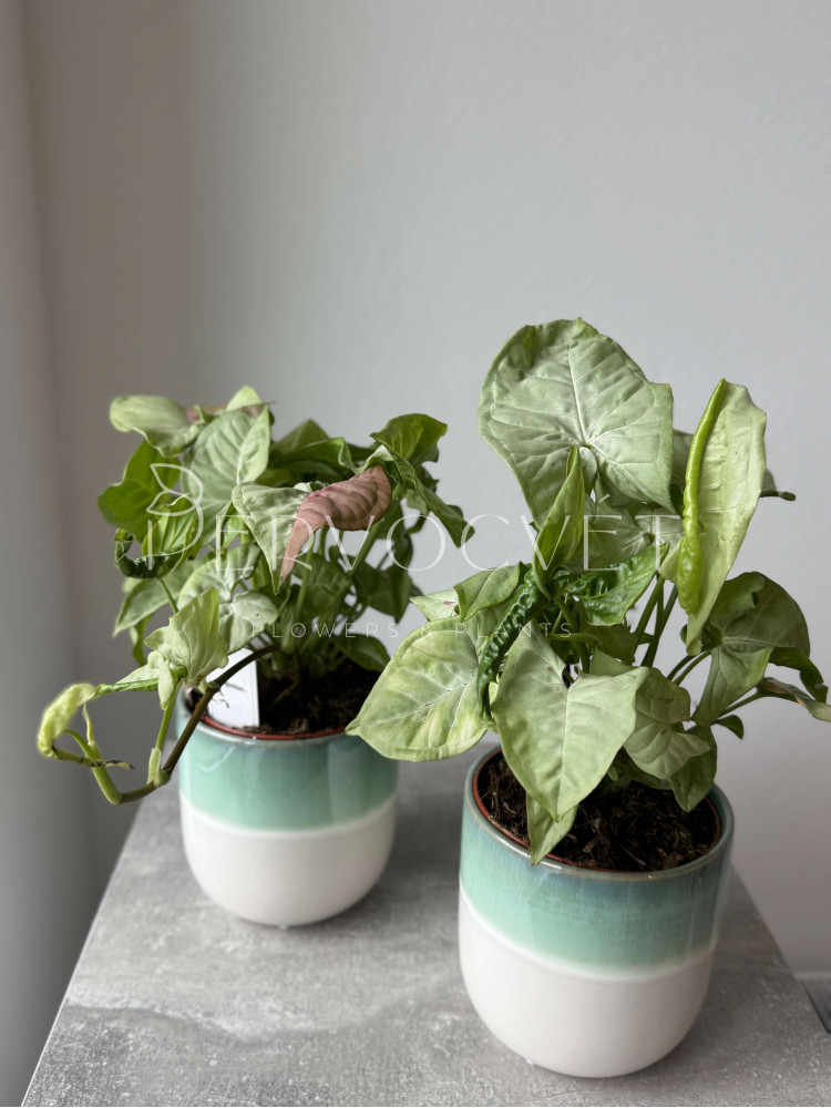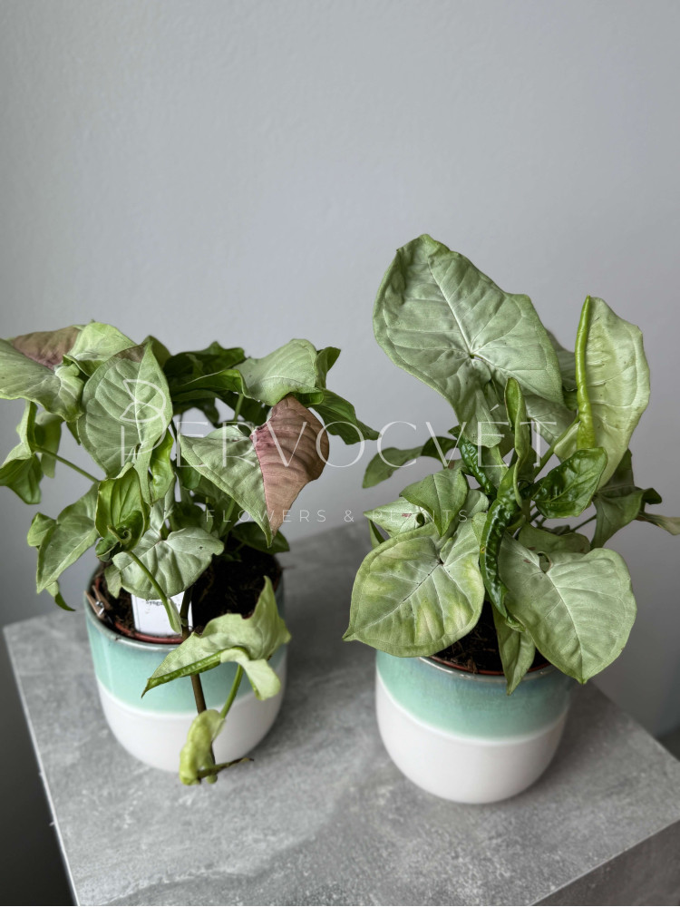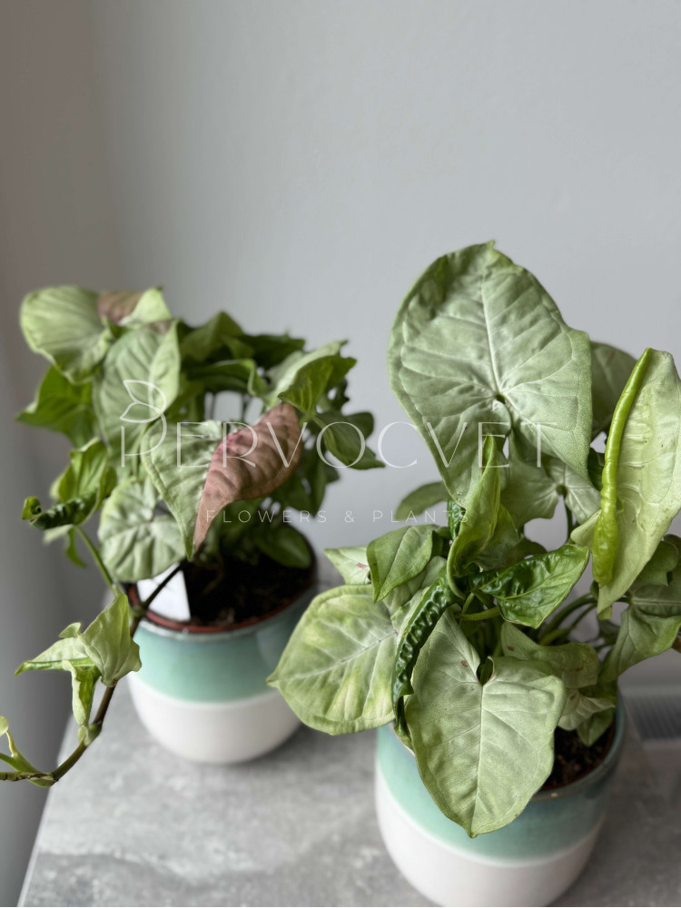 Сингониум - представитель семейства Ароидные. Представляет собой травянистую лиану, обладает воздушными корнями и тонкими побегами. Сингониум является родственником растения Филодендрон. Листовые пластины имеют стреловидную форму С возрастом рассечение увеличивается. Для роста растение нужно будет обзавестись опорами. Растение неприхотливое и часто культивируется как ампель. Сорт Конфетти отличается розовой пятнистостью (вариегатностью) и толстый ветвящийся стебель, листики, отличающиеся светло-зеленым, мятным оттенком, с возрастом меняют стреловидную форму на форму неправильной звезды.