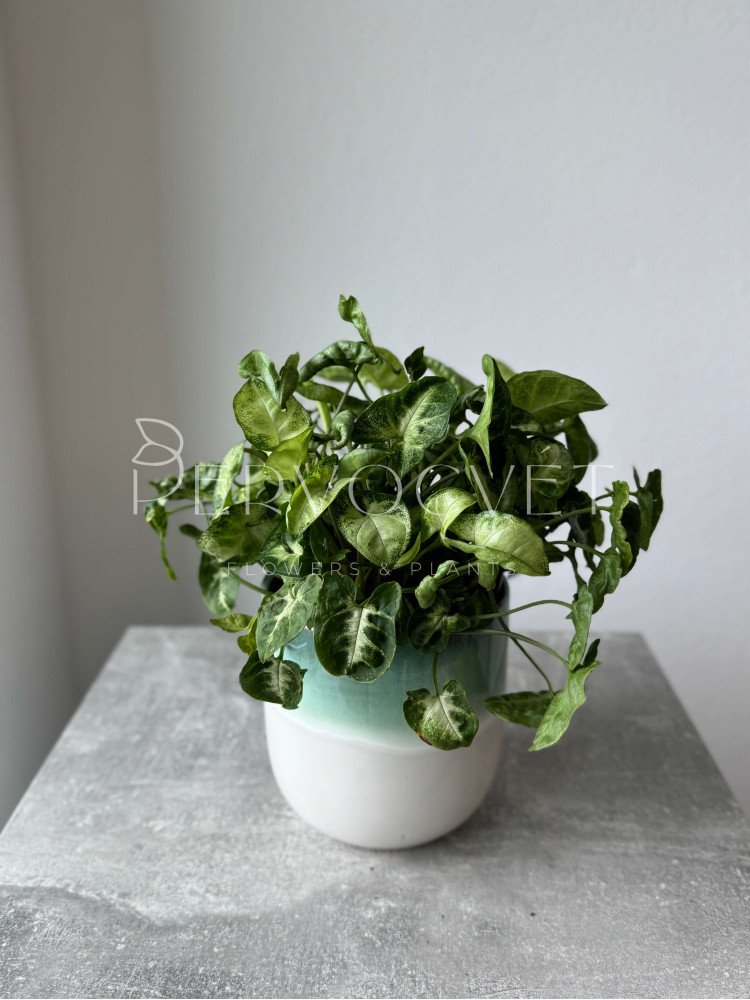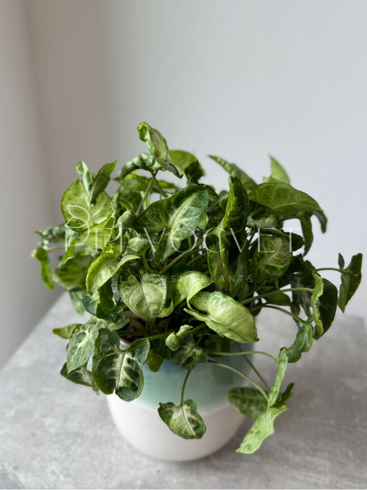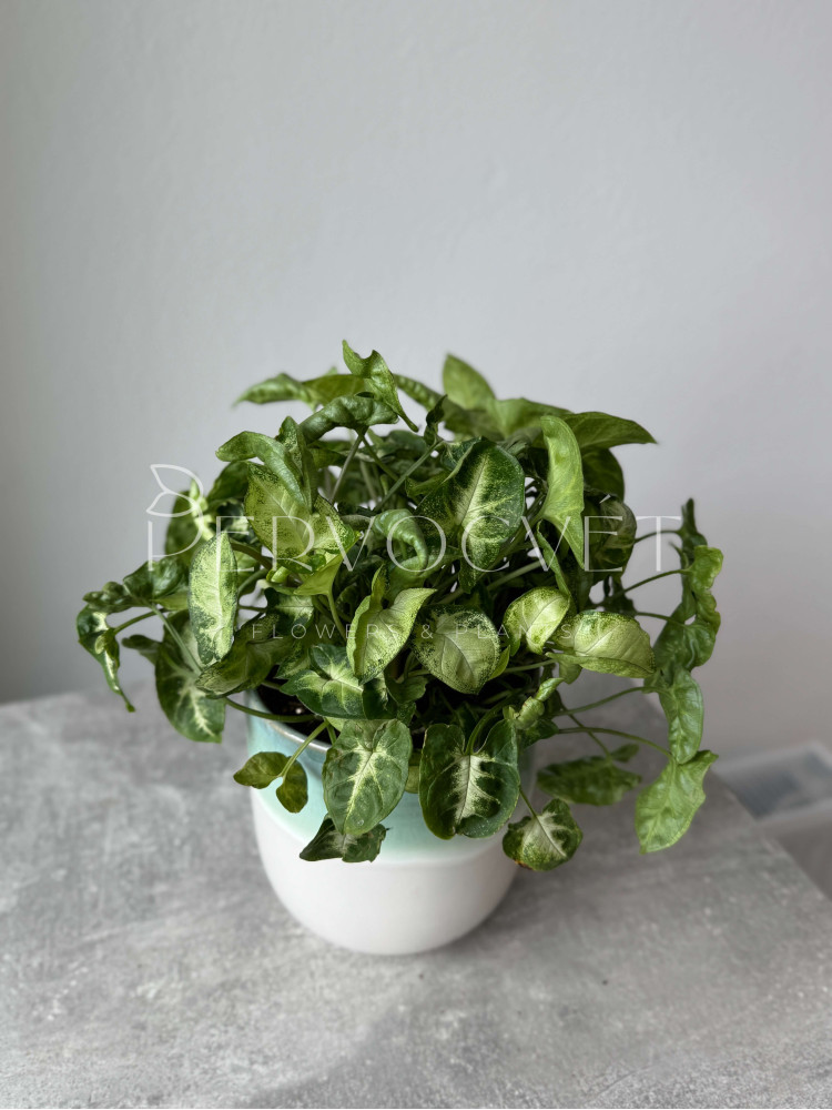 Сингониум - представитель семейства Ароидные. Представляет собой травянистую лиану, обладает воздушными корнями и тонкими побегами. Сингониум является родственником растения Филодендрон. Листовые пластины имеют стреловидную форму С возрастом рассечение увеличивается. Для роста растение нужно будет обзавестись опорами. Растение неприхотливое и часто культивируется как ампель. Сорт Пикси - характеризуется меньшими листовыми пластинами, нежели классический сорт.