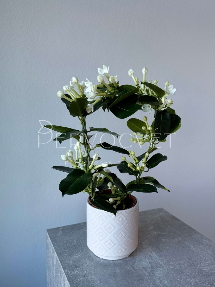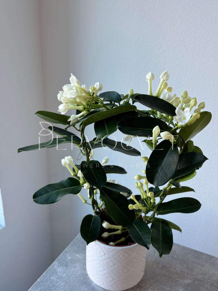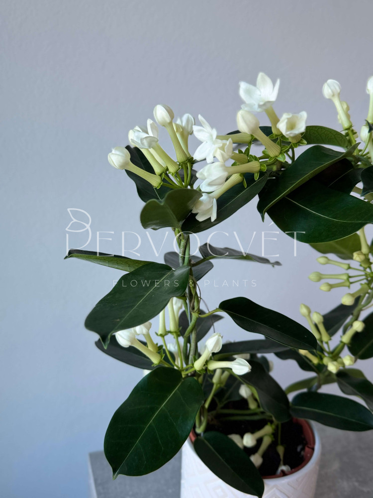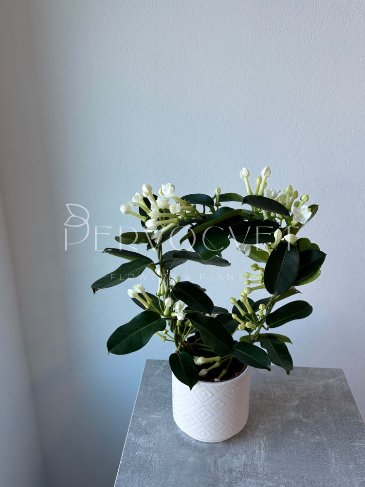 Стефанотис Обильноцветущий - лиана многолетник, из семейства Ластовневые. Растение, которое встречается только в тропиках Азии и на Мадагаскаре. Стефанотис пахнет очень интенсивно, и почти парфюмированный аромат похож на то, как пахнет жасмин. Лиана относится к быстрорастущим и ежегодно способна прибавлять до 30-50 см в длину. Цветки белые, собраны в зонтичные соцветия. Для растения очень важен режим полива и хороший грунт (читайте про уход ниже).