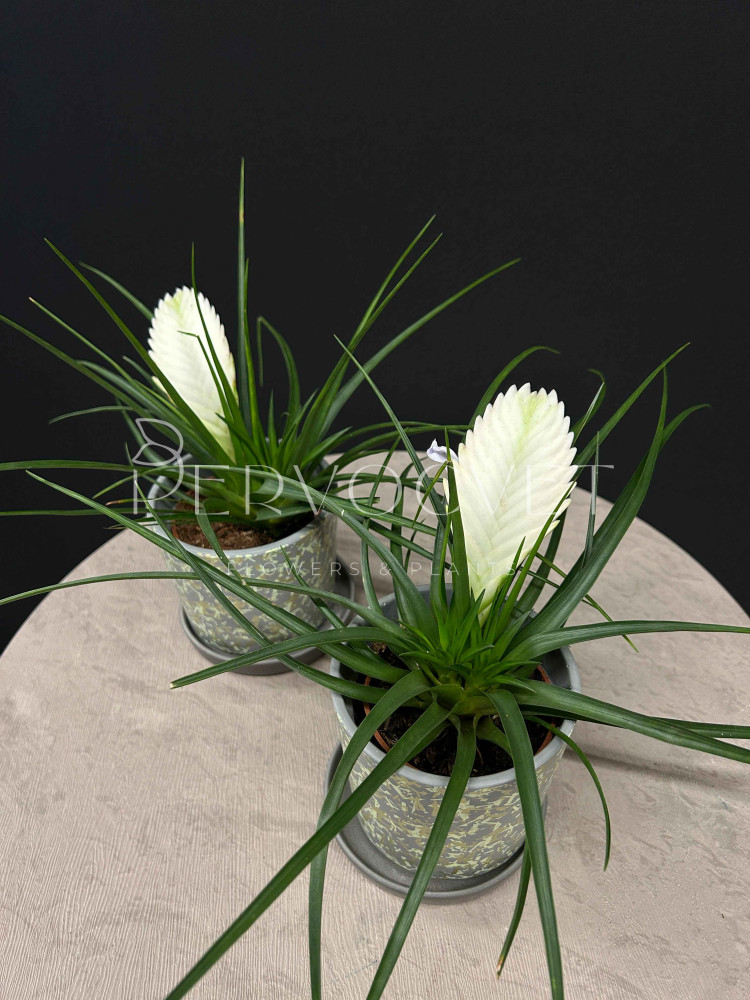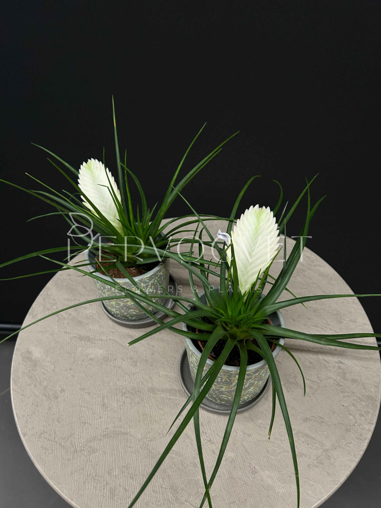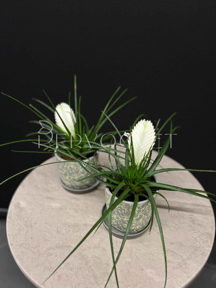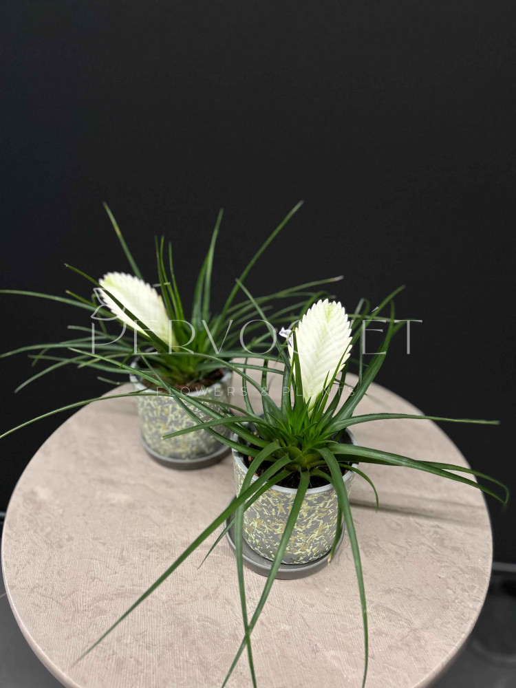 Тилландсия Цианея Анита - также известная как "розовое перо", благодаря самому популярному оттенку прицветника. Эпифит семейства Бромелиевых. Растение характеризуется объемной розеткой с заостренными листьями. Оттенки соцветия могут быть от белого до красного, а из прицветника распускаются маленькие белые, голубые или сине-фиолетовые цветы. Растение подходит для флорариума.