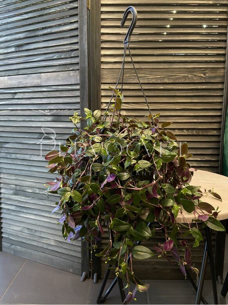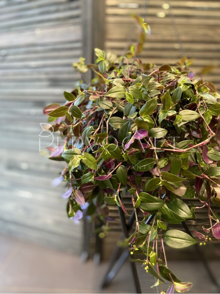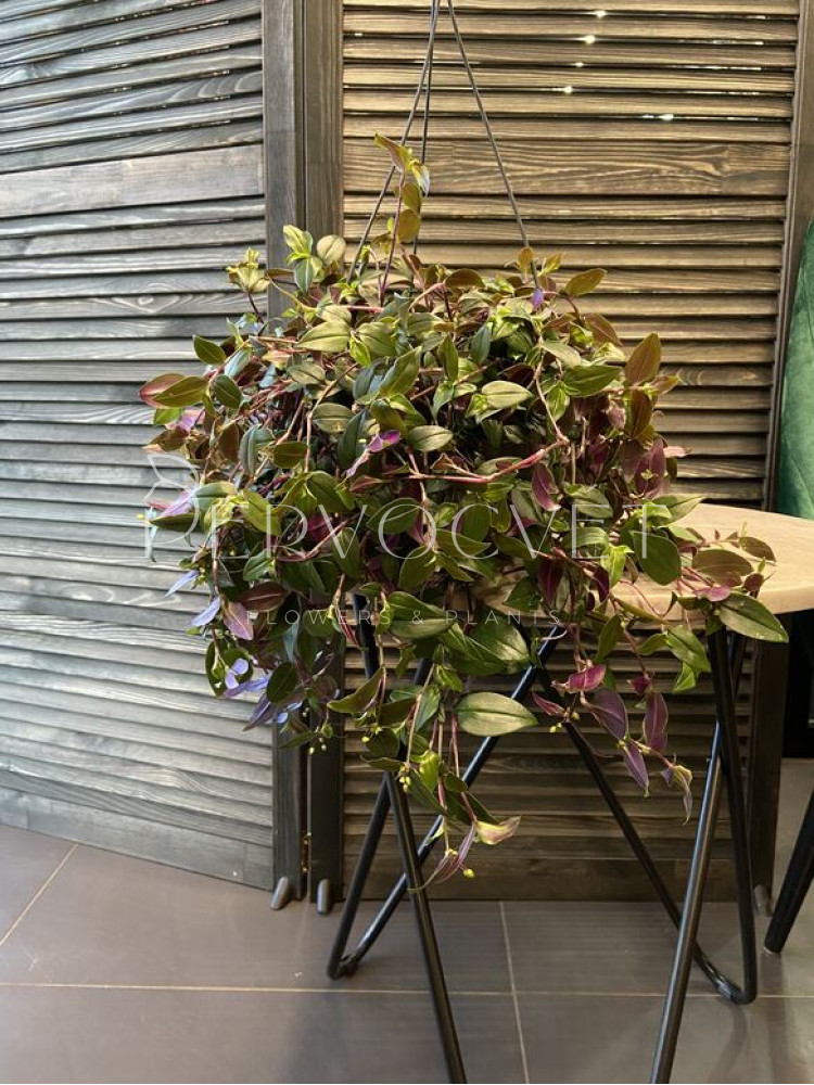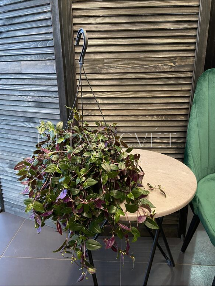 Традесканция Висячая - нежный многолетник семейства Паутинных, с сочными стеблями и ланцетными двухцветными листьями. Растение неприхотливое, в некоторых странах даже считается сорняком. Вид привлекательной подвесной корзинки определенно радует глаз и привлекает внимание.