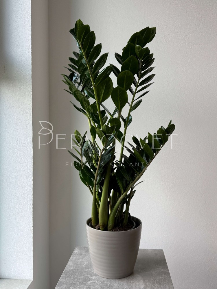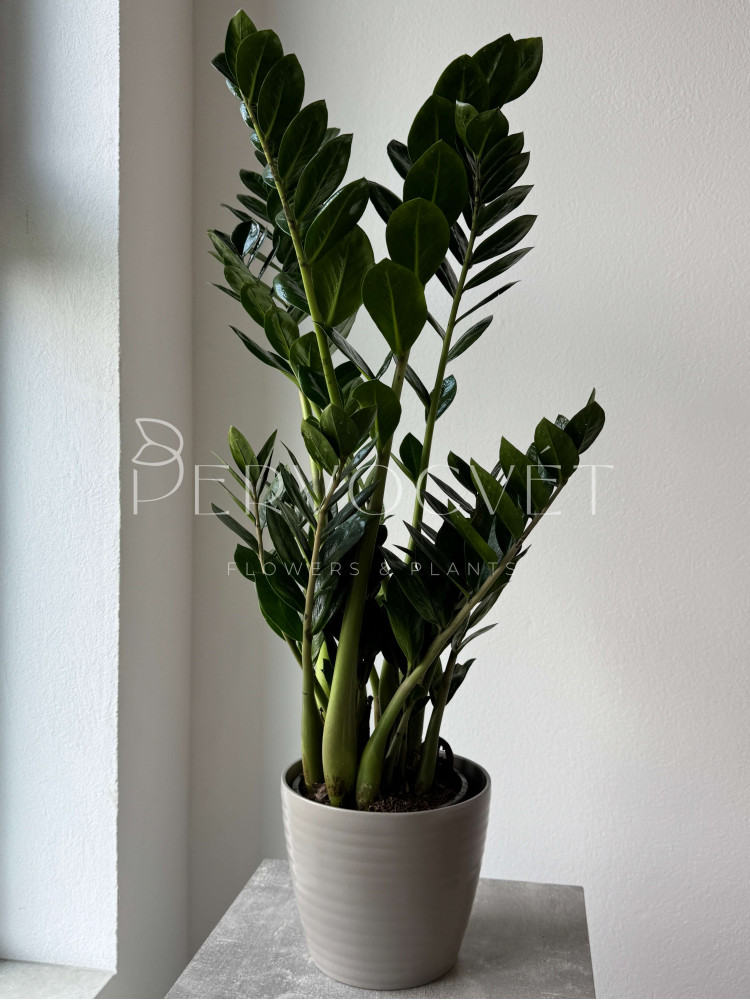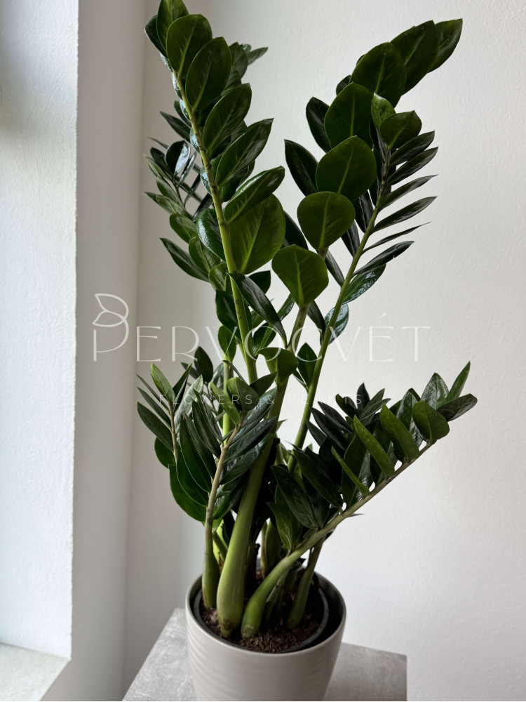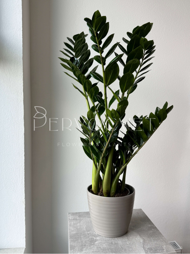 Замиокулькас - всем известное "долларовое дерево", неприхотливое растение с острыми листиками, расположенными по всей длине побега, покрытыми восковым налетом, что придает растению необычный декоративный вид.