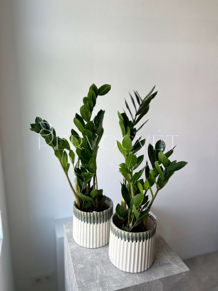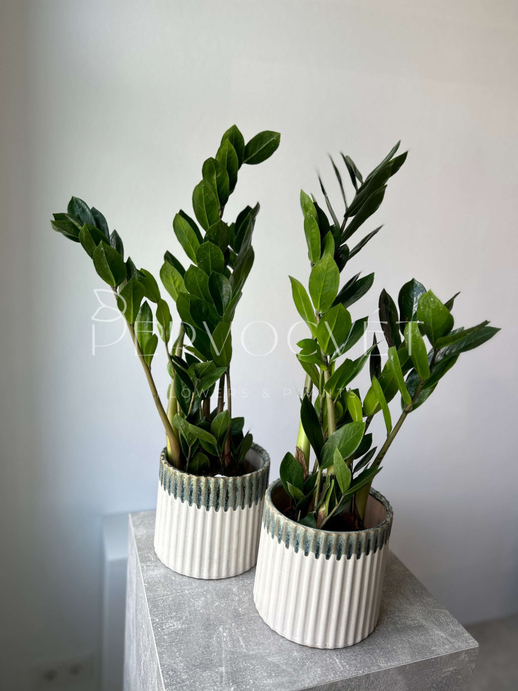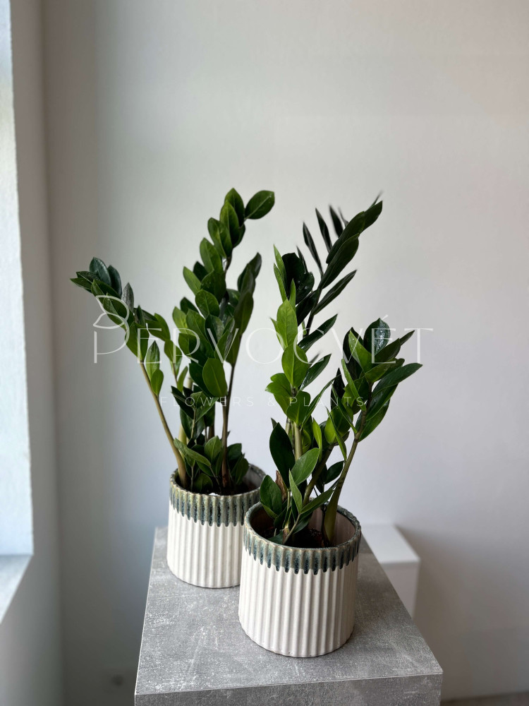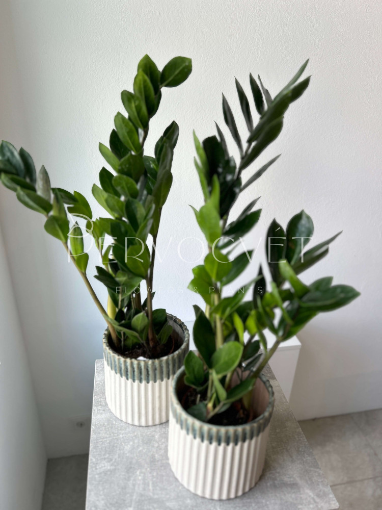 Замиокулькас - всем известное "долларовое дерево", неприхотливое растение с острыми листиками, расположенными по всей длине побега, покрытыми восковым налетом, что придает растению необычный декоративный вид.