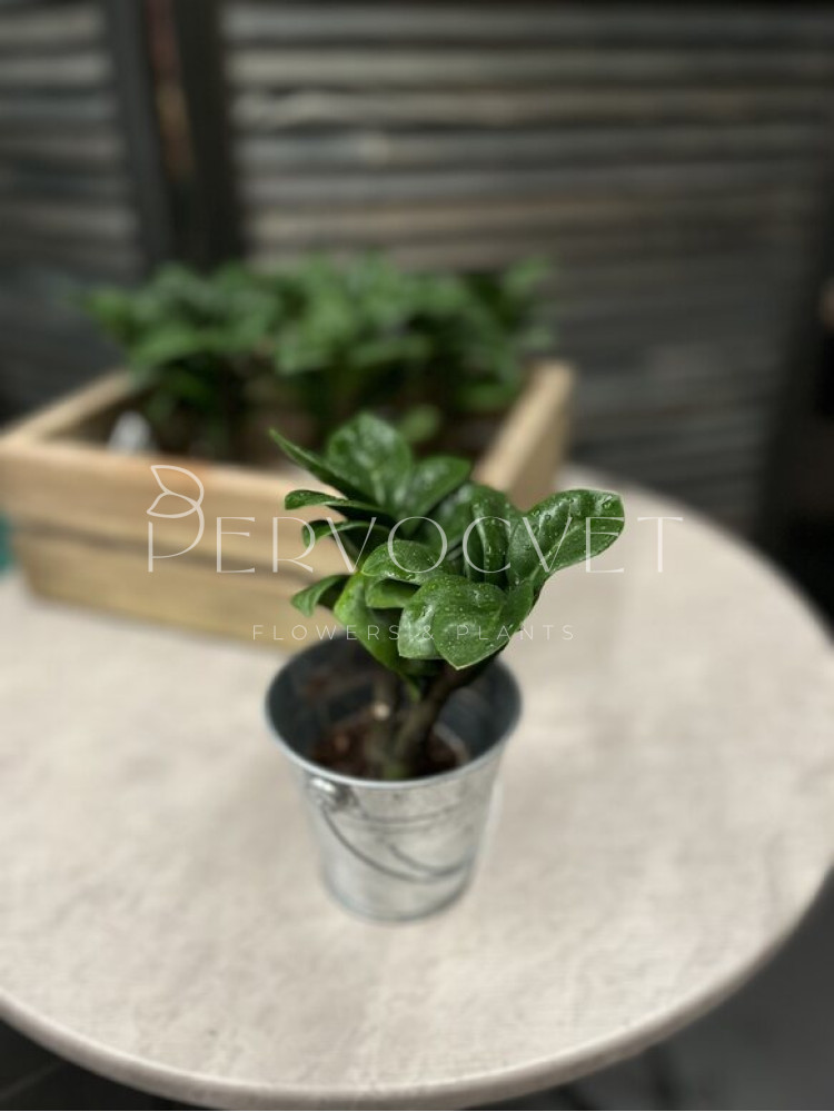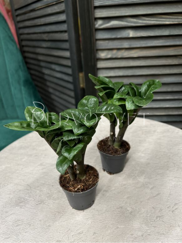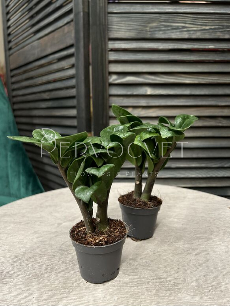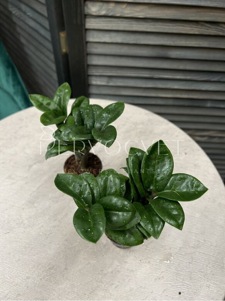 Замиокулькас - всем известное "долларовое дерево", неприхотливое растение с острыми листиками, расположенными по всей длине побега, покрытыми восковым налетом, что придает растению необычный декоративный вид. Сорт Зензи - карликовая форма, с малым расстоянием междоузлий.