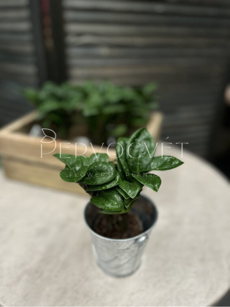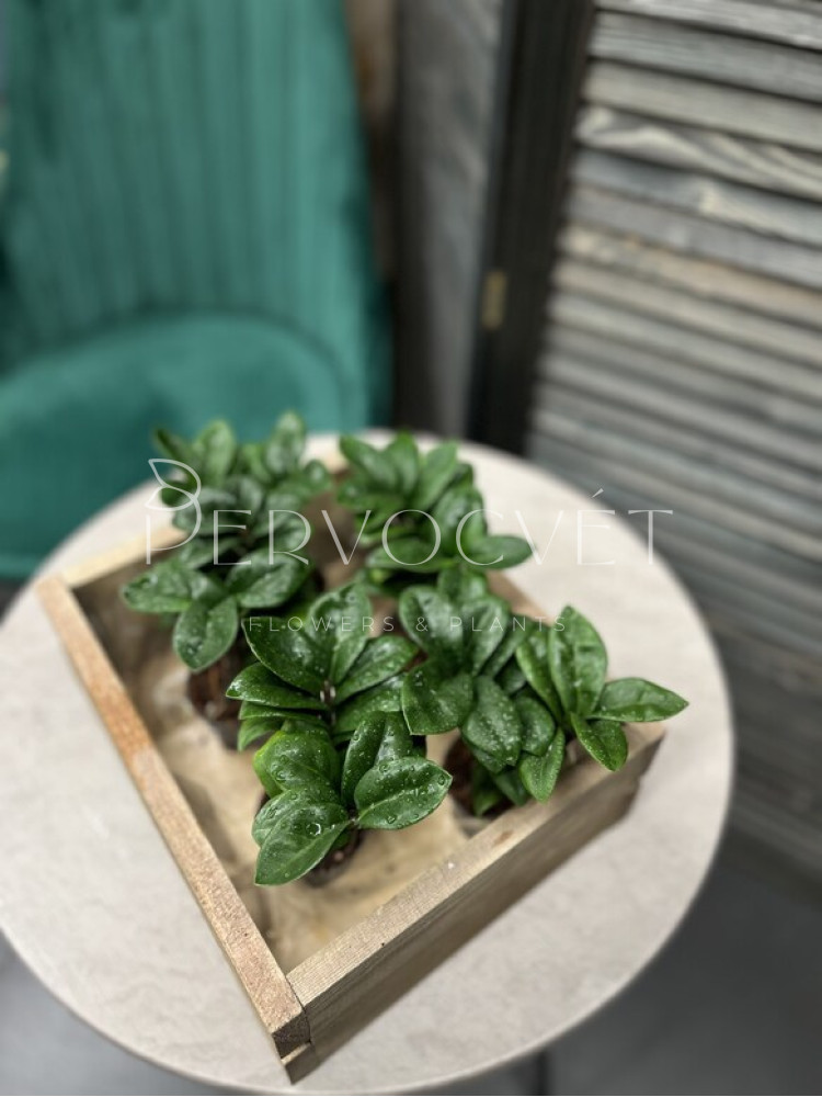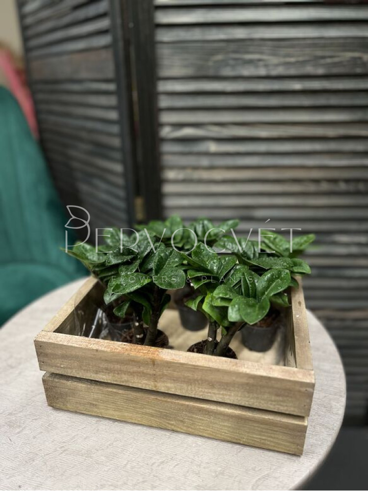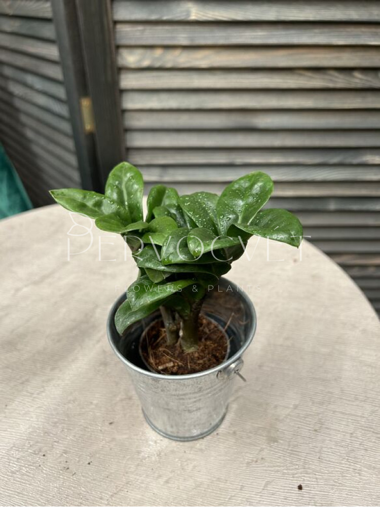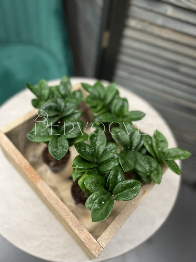 Замиокулькас - всем известное "долларовое дерево", неприхотливое растение с острыми листиками, расположенными по всей длине побега, покрытыми восковым налетом, что придает растению необычный декоративный вид. Сорт Зензи - карликовая форма, с малым расстоянием междоузлий.