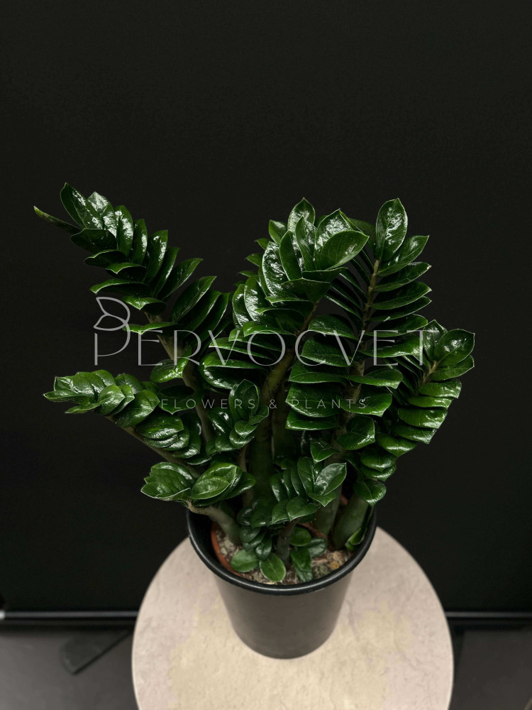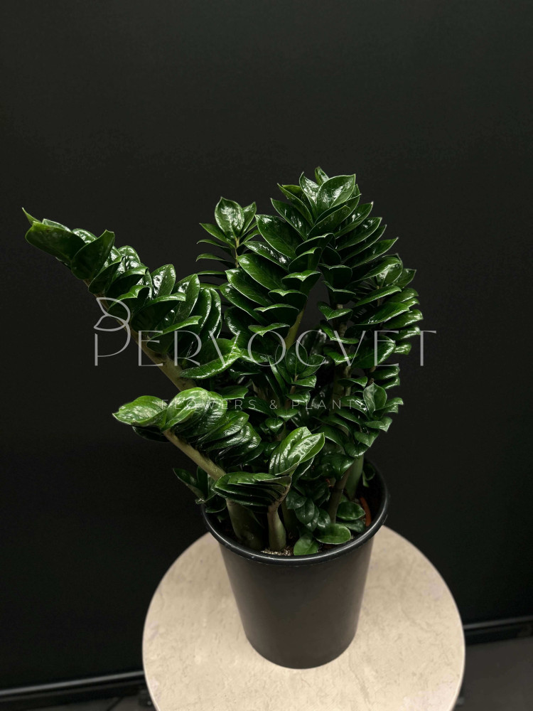 Замиокулькас - всем известное "долларовое дерево", неприхотливое растение с острыми листиками, расположенными по всей длине побега, покрытыми восковым налетом, что придает растению необычный декоративный вид. Сорт Зензи - карликовая форма, с малым расстоянием междоузлий.