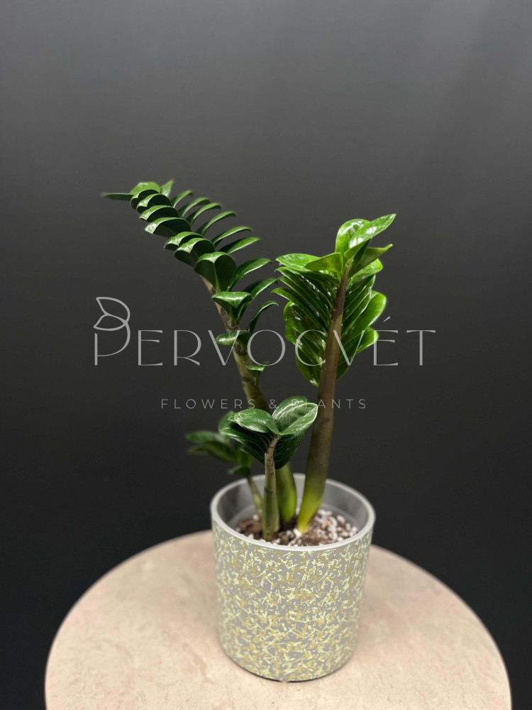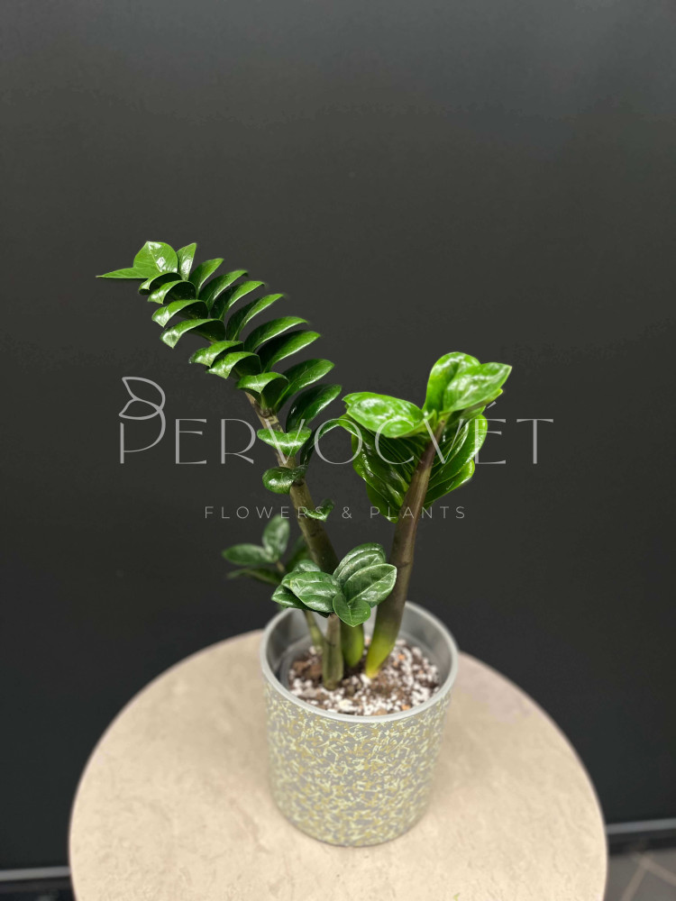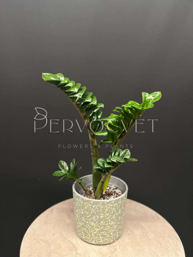Замиокулькас - всем известное "долларовое дерево", неприхотливое растение с острыми листиками, расположенными по всей длине побега, покрытыми восковым налетом, что придает растению необычный декоративный вид. Сорт Зензи - карликовая форма, с малым расстоянием междоузлий.