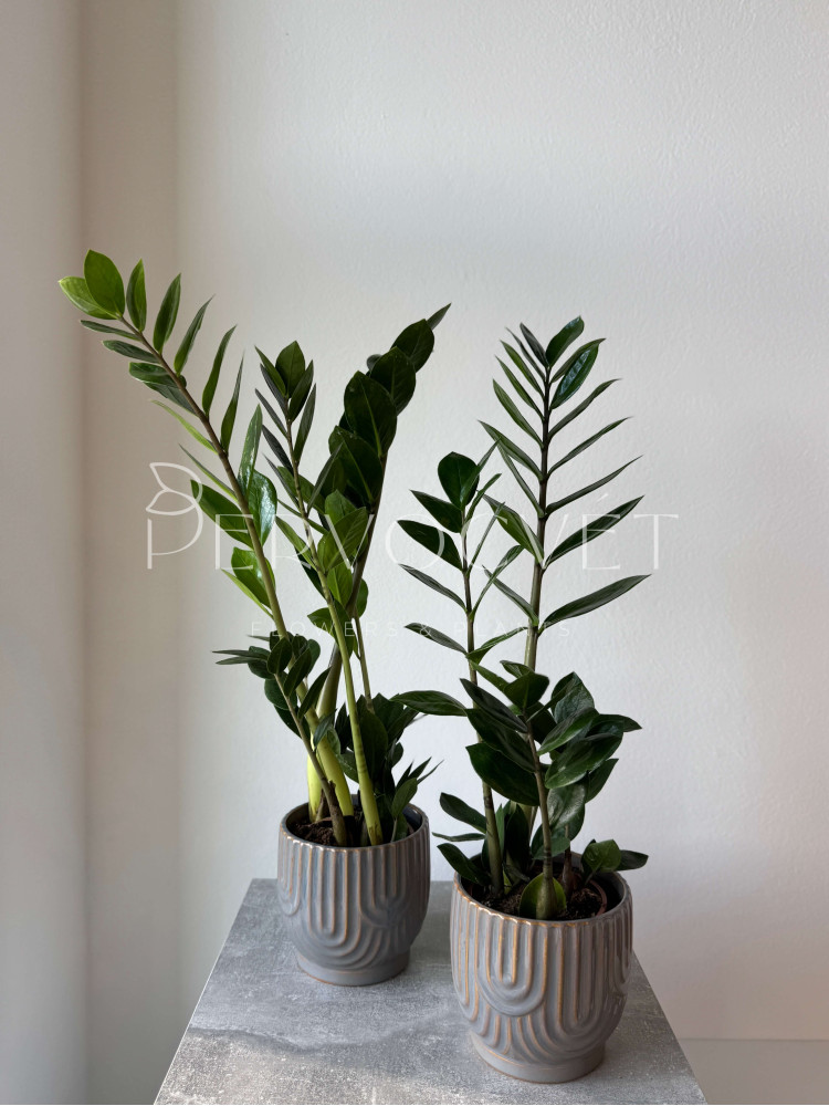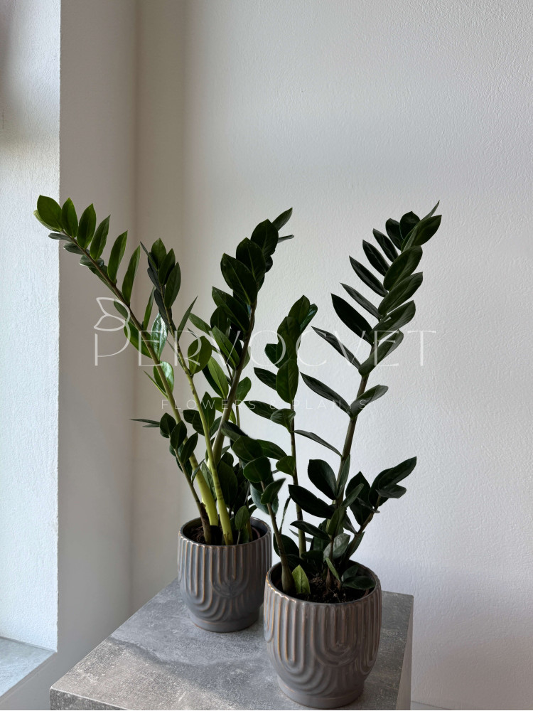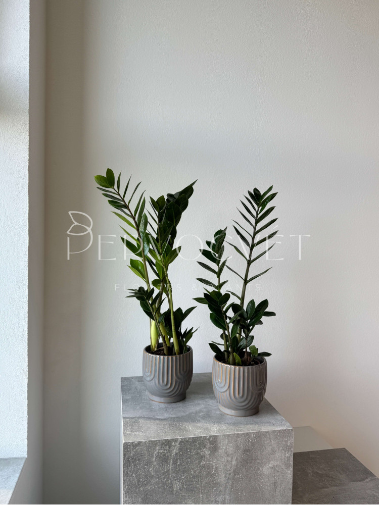 Замиокулькас - всем известное "долларовое дерево", неприхотливое растение с острыми листиками, расположенными по всей длине побега, покрытыми восковым налетом, что придает растению необычный декоративный вид.