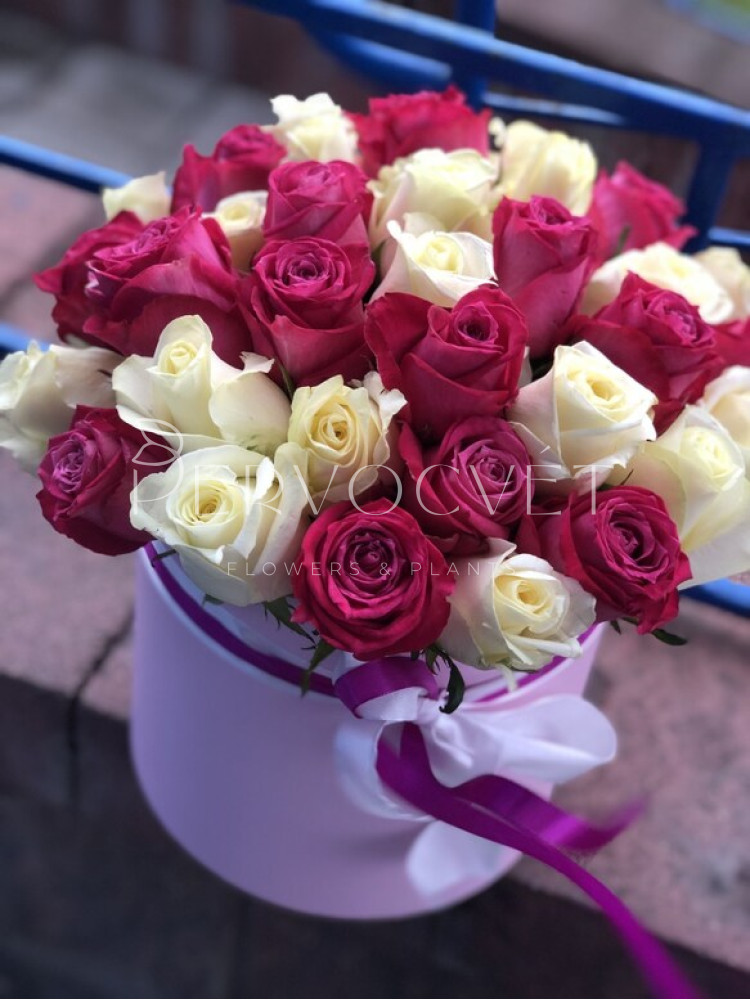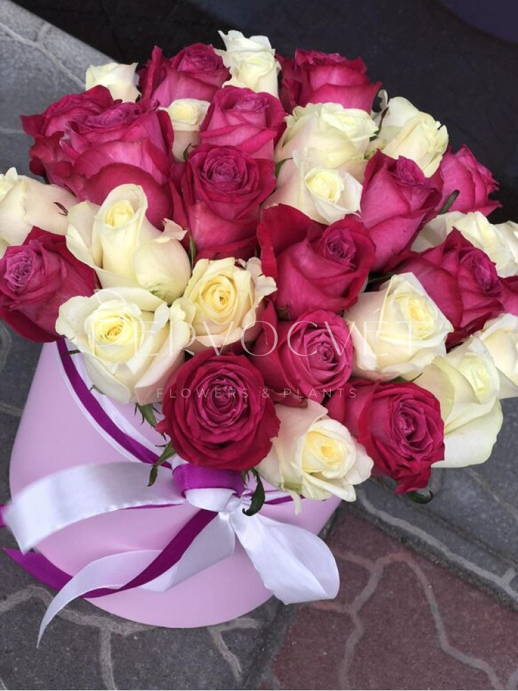 Два сорта самых любимых всеми роз: белых и малиновых, в шляпной коробке. Можно собрать композицию в таких оттенках и сортах, или из двух, или трех оттенках других роз, из ассортимента в наличии.