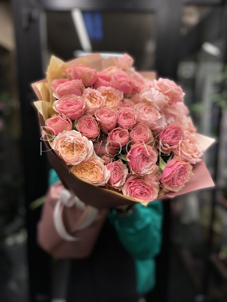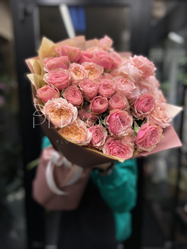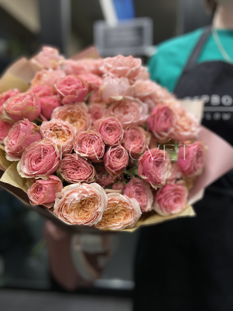 Две самые желанные пионовидные кустовые розы в одном букете - Джульетта и Гранд Трендсеттер. Шикарные многочисленные бутоны в пышной упаковке!