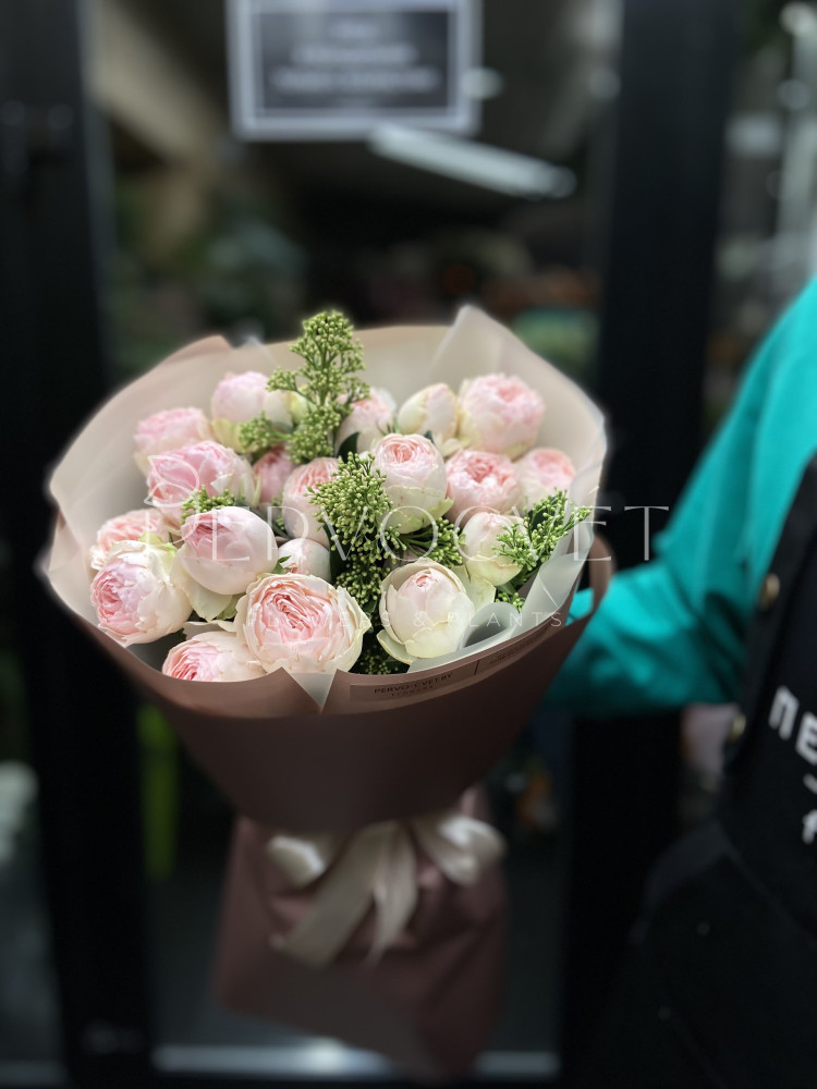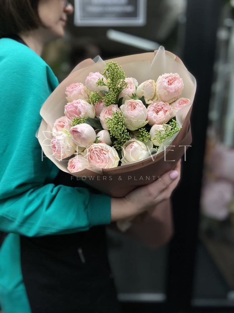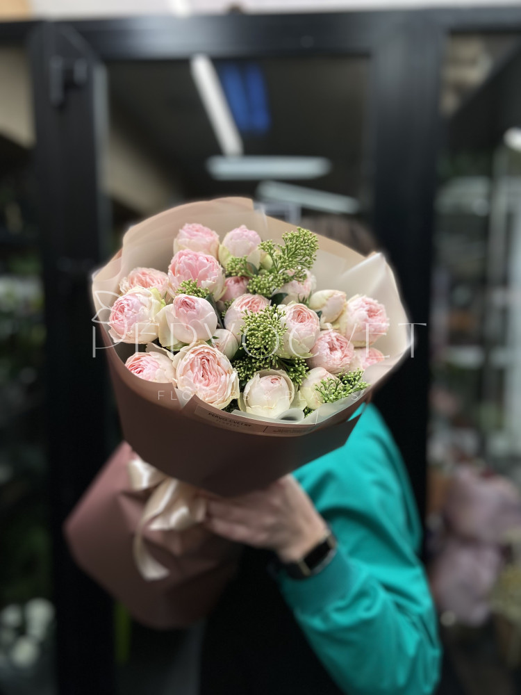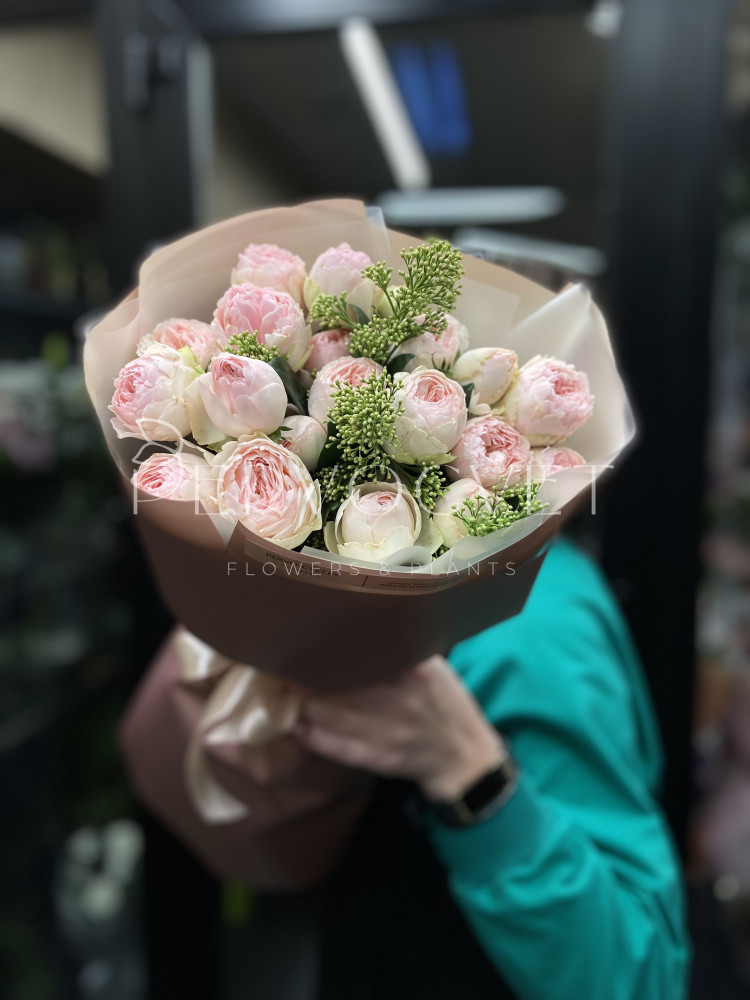 Букет из нежно-розовых бутонов кустовой пионовидной розы Менсфилд Парк с ягодами скиммии. Нежный букет редкой шикарной розы в пышной упаковке.