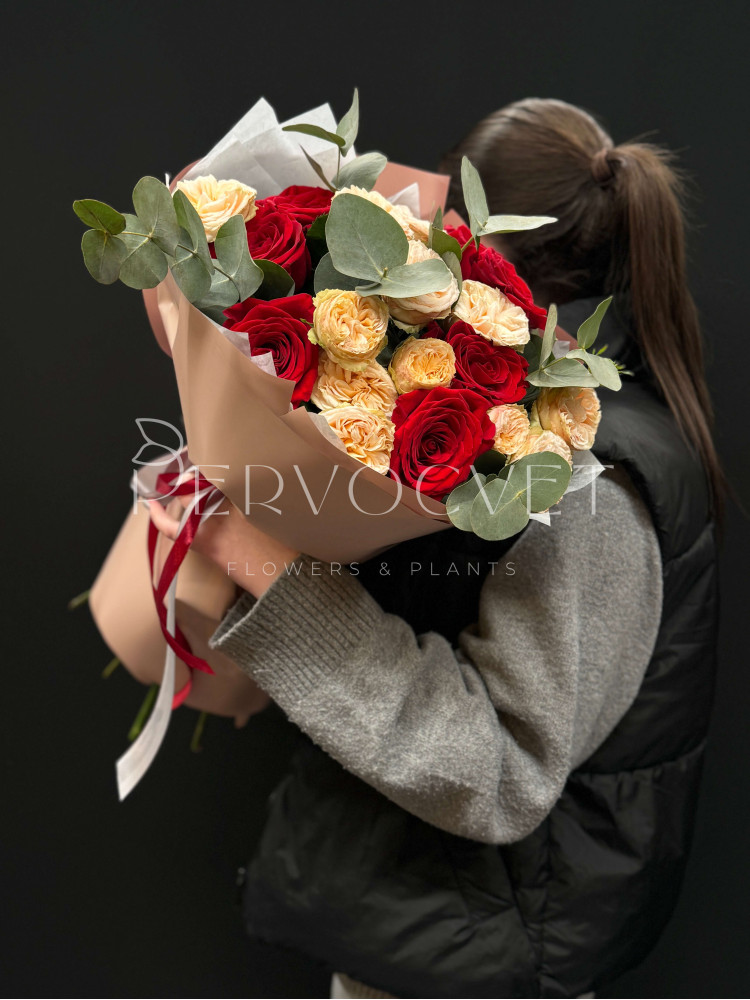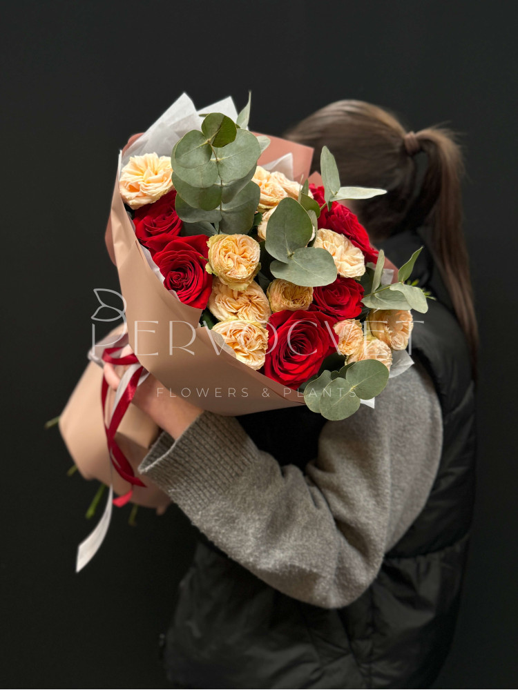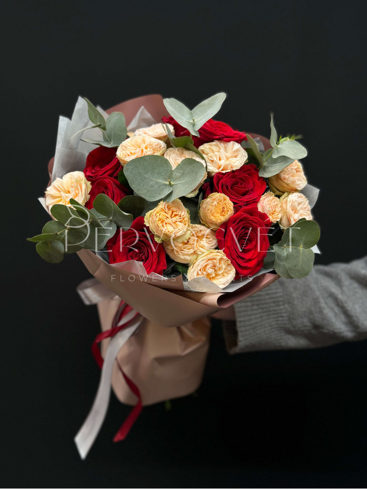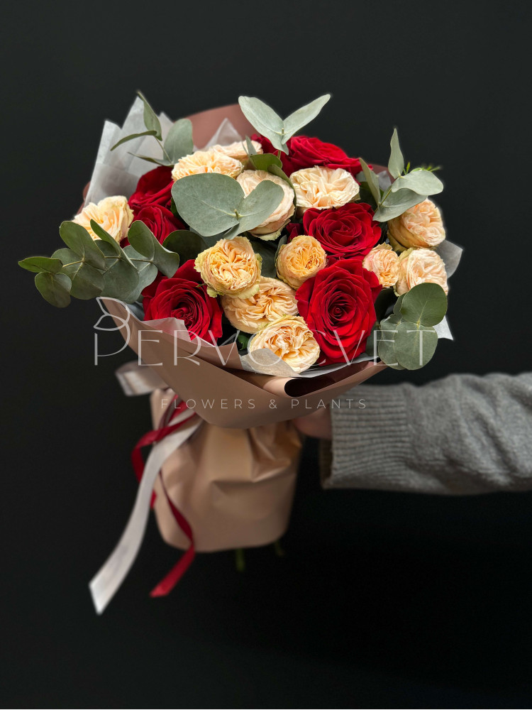 состав: роза красная Эквадор, кустовая пионовидная роза Трендсеттер, эвкалипт