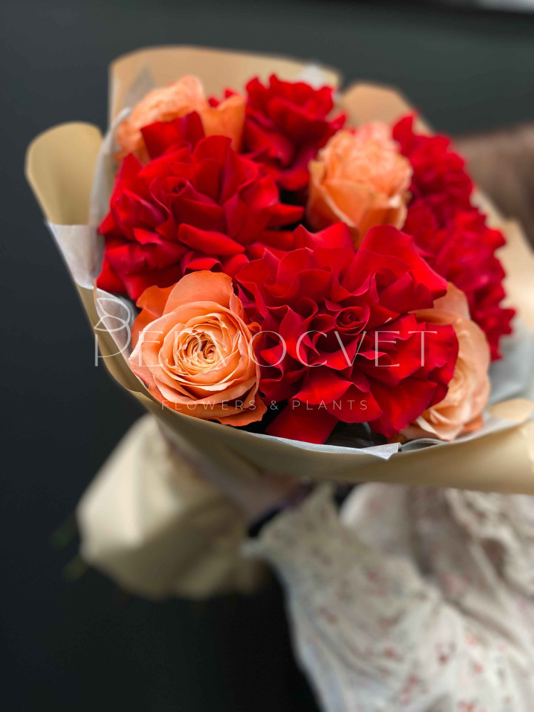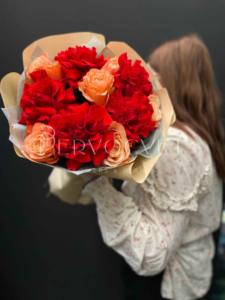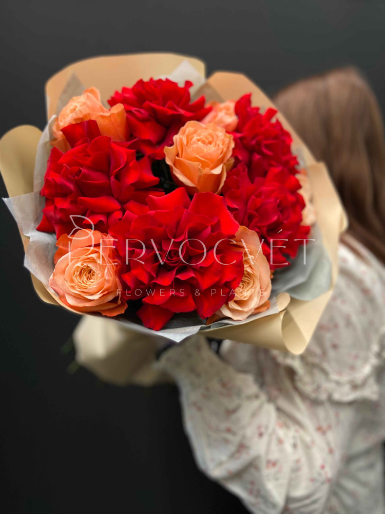 Дуо-букет из самых желанных ярких роз: красная французская роза сорта Фридом и пионовидная ароматная роза сорта Кахала. Два ярких оттенка: красный и оранжевый в пышной упаковке!