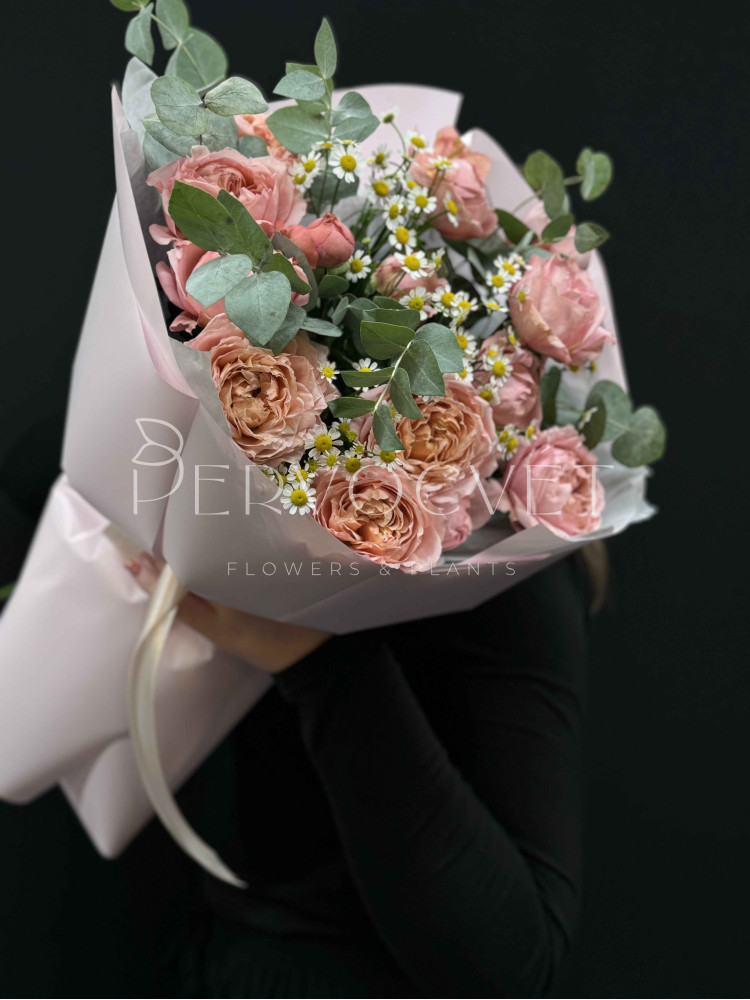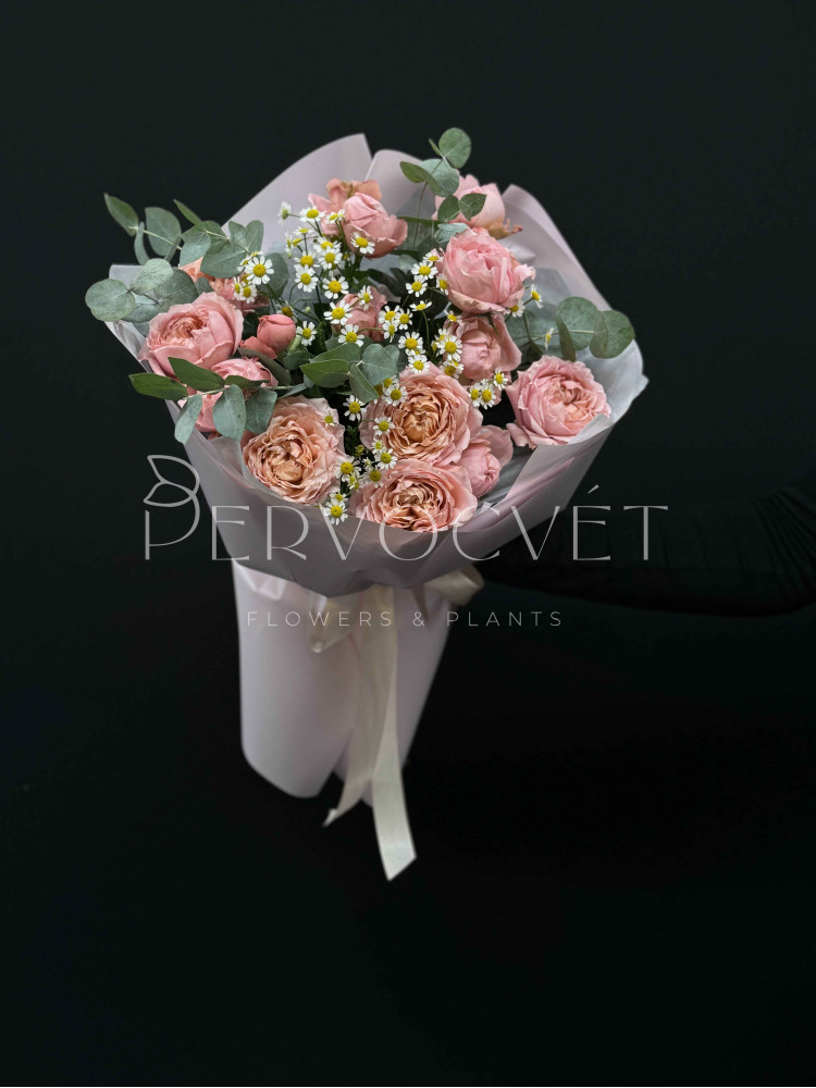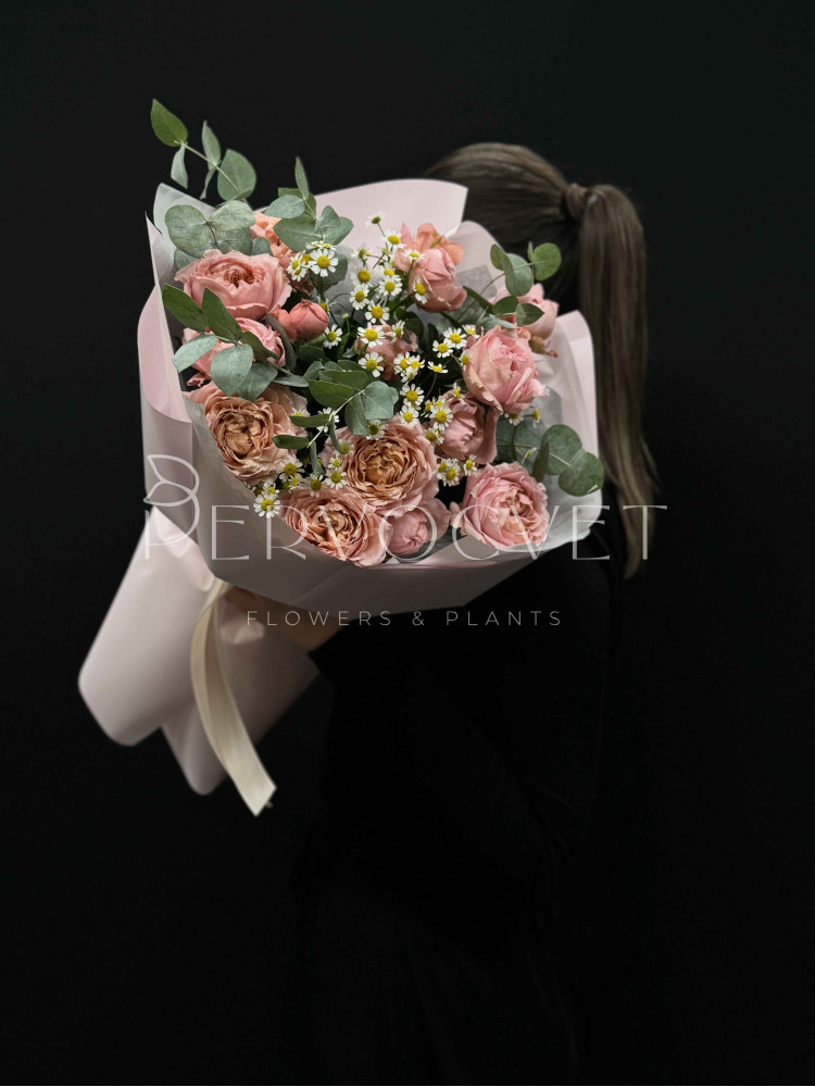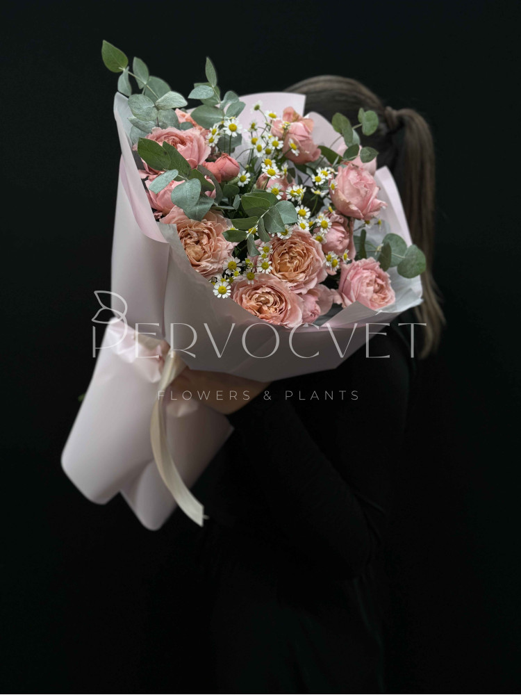 - БОЛЬШОЙ - кустовая пионовидная роза Джульетта 9, танацетум 5, эвкалипт