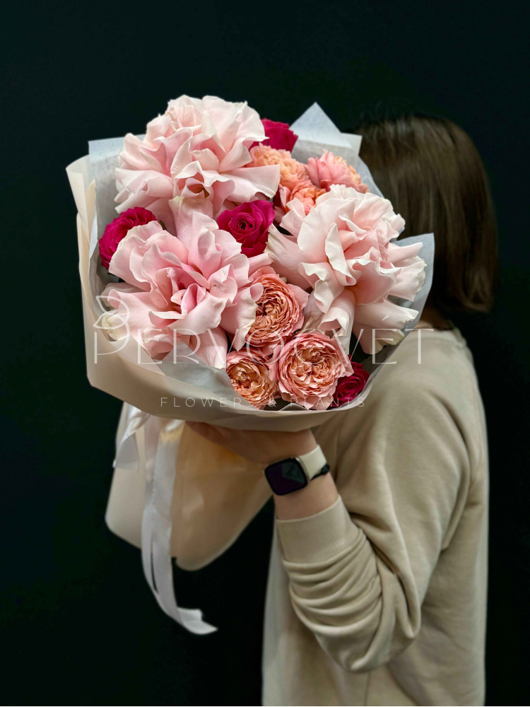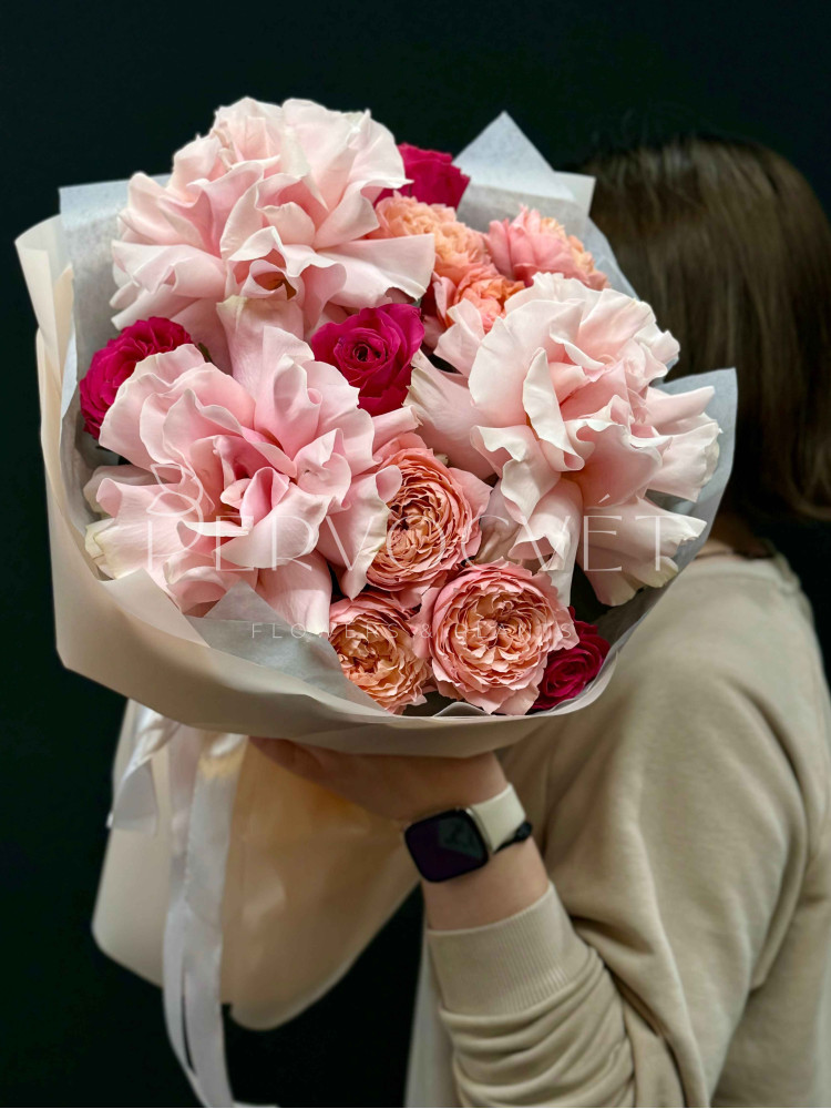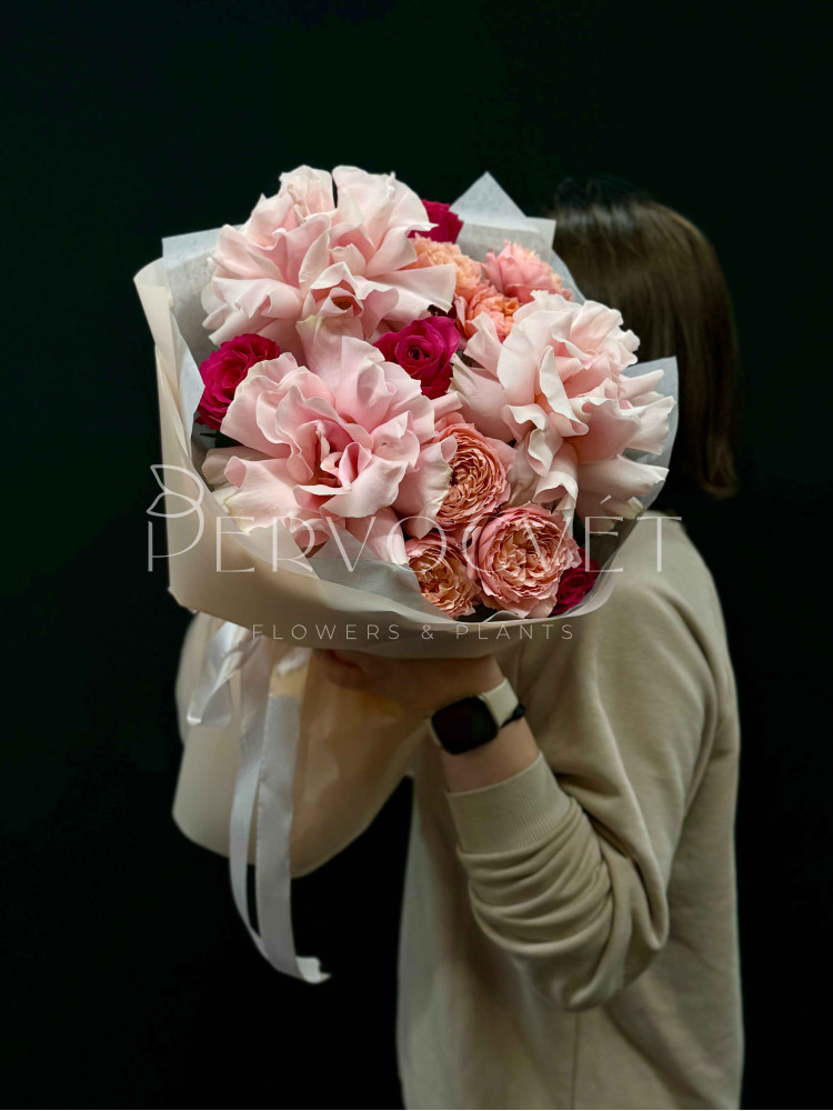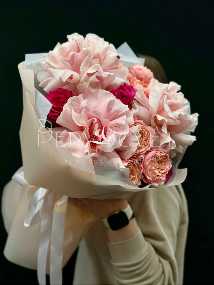 Букет розовых роз, но совсем не классика, а настоящая утонченная редкость: сочетание нежных французских роз сорта Мондиаль, пионовидных кустовых роз сорта Джульетта и малиновой классической розы. Разные фактуры и все оттенки розового - рецепт идеального розового букета, в обоих смыслах!