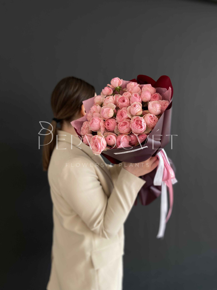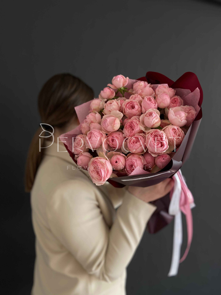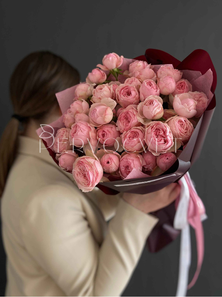 Нежно-розовые "шарики" кустовой пионовидной розы редкого сорта Менсвилд Парк, которую так часто путают с пионами. Многочисленные шаровидные бутоны роз, в пышной упаковке - красивый подарок, стойкий букет для дома.