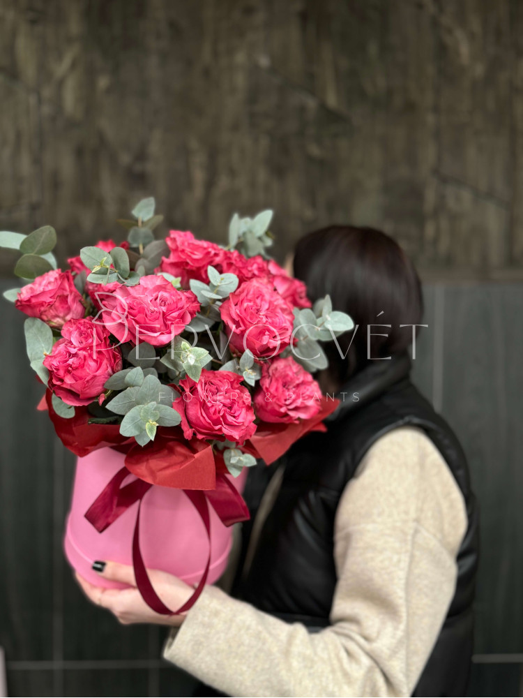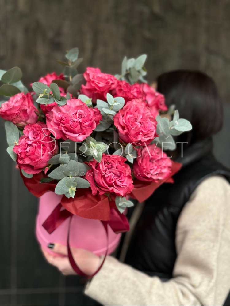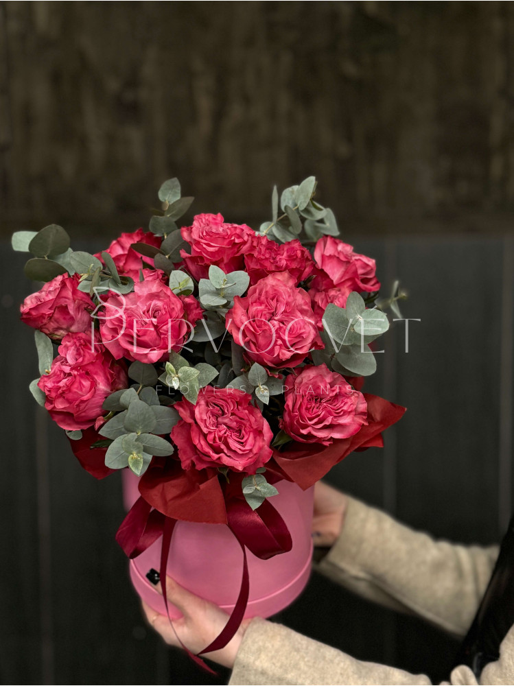 Композиция в коробке из малиновых пионовидных роз сорта Кантри Блюз, каждый бутон которого сложен лепестками в двойную бесконечность. Что же это может означать в вашем случае? Бесконечную любовь, бесконечную признательность, бесконечную близость и заботу?! Очень стойкая пионовидная роза в идеальном сочетании с зеленью эвкалипта подойдет для любого повода.