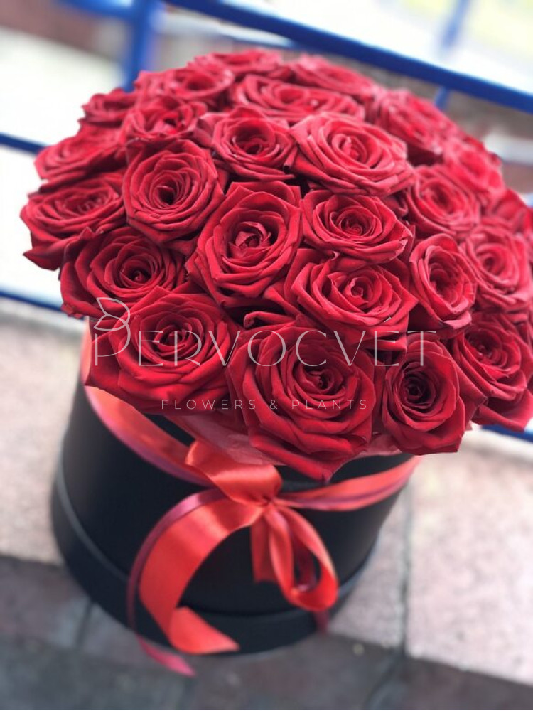 Стильная композиция из роз красного цвета в черной коробке. Идельный подарок для стильного интерьера!