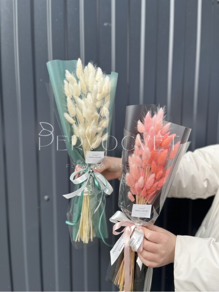 Букетики из лагуруса, могут быть выполнены из любого оттенка из ассортимента в наличии: натуральный бежевый, белый, желтый, оранжевый, красный, бордовый, розово-пудровый, розовый, зеленый, голубой, сиреневый и другие.