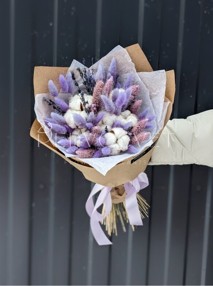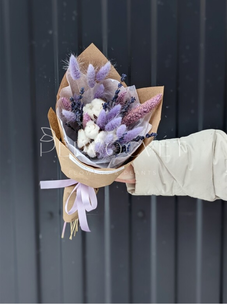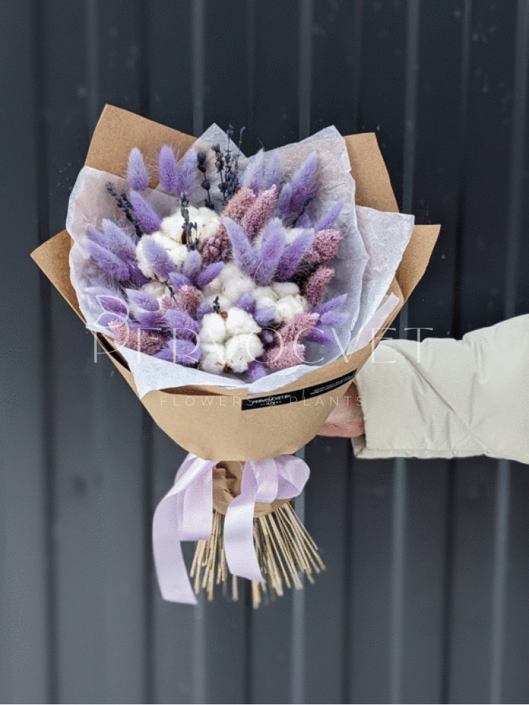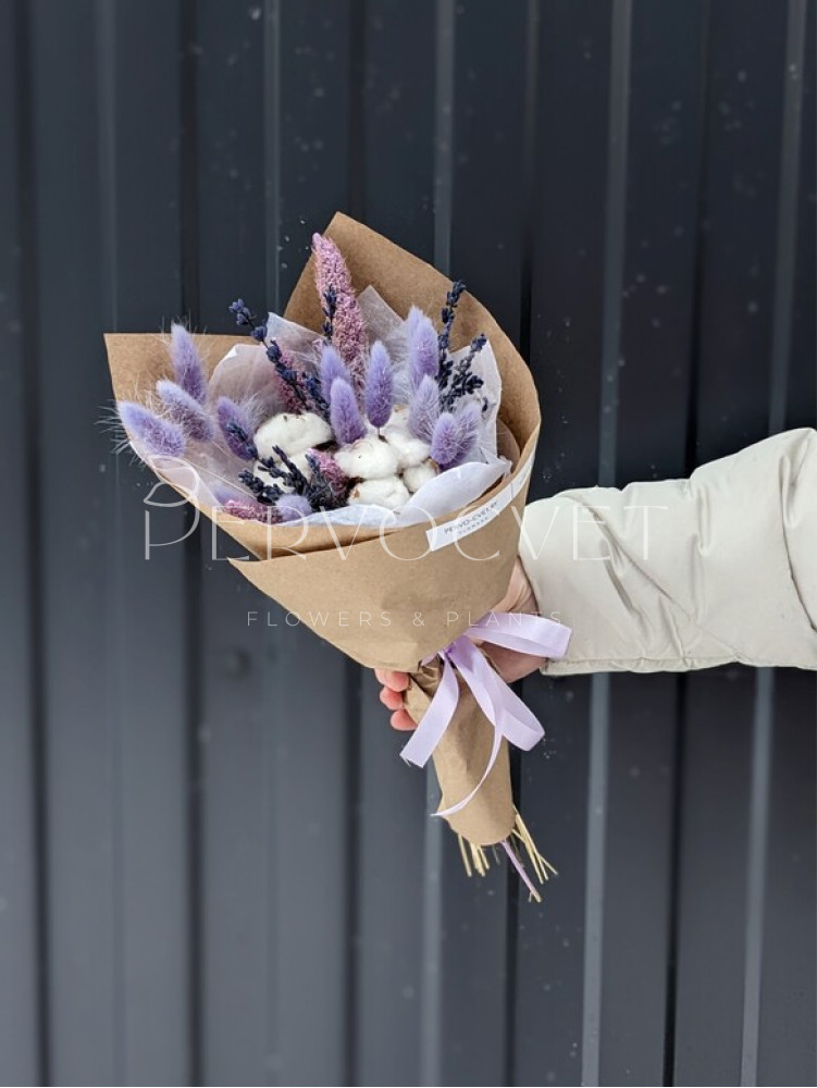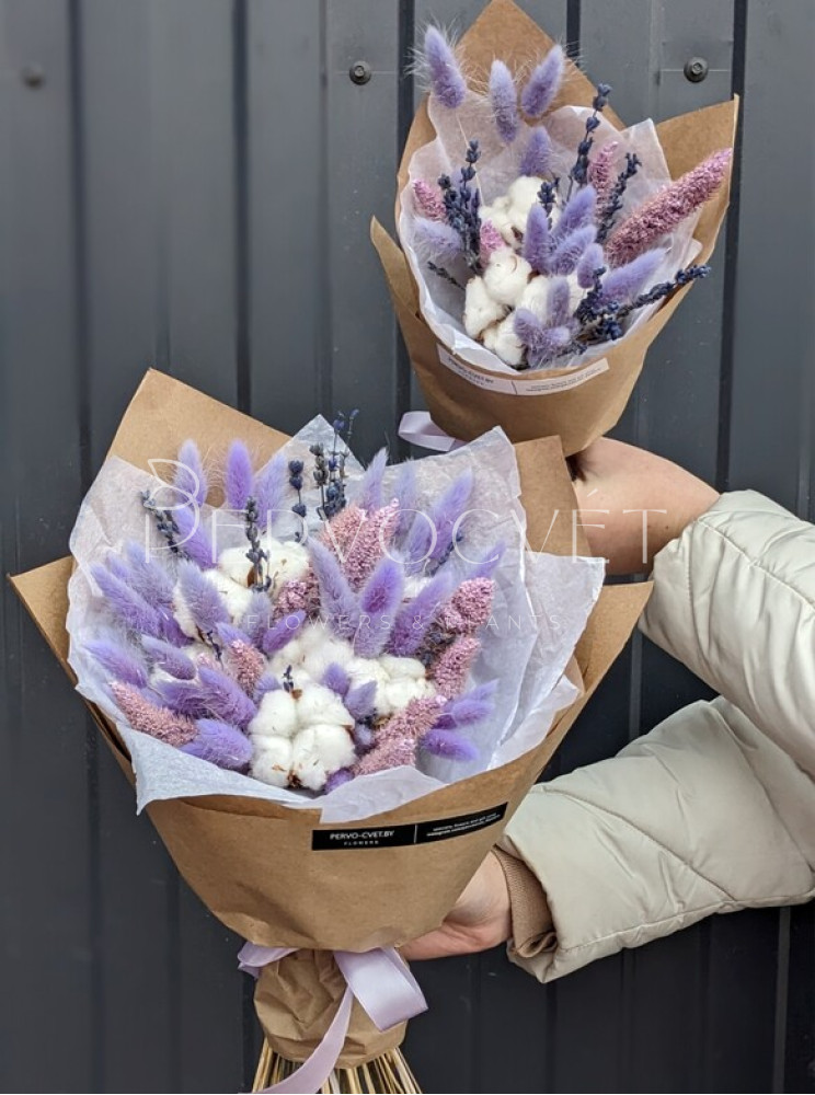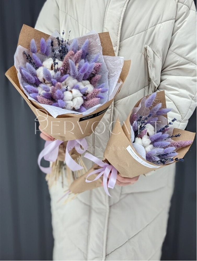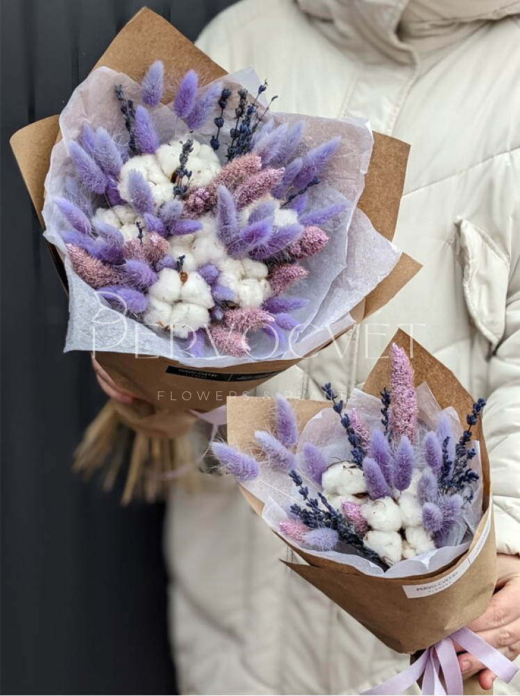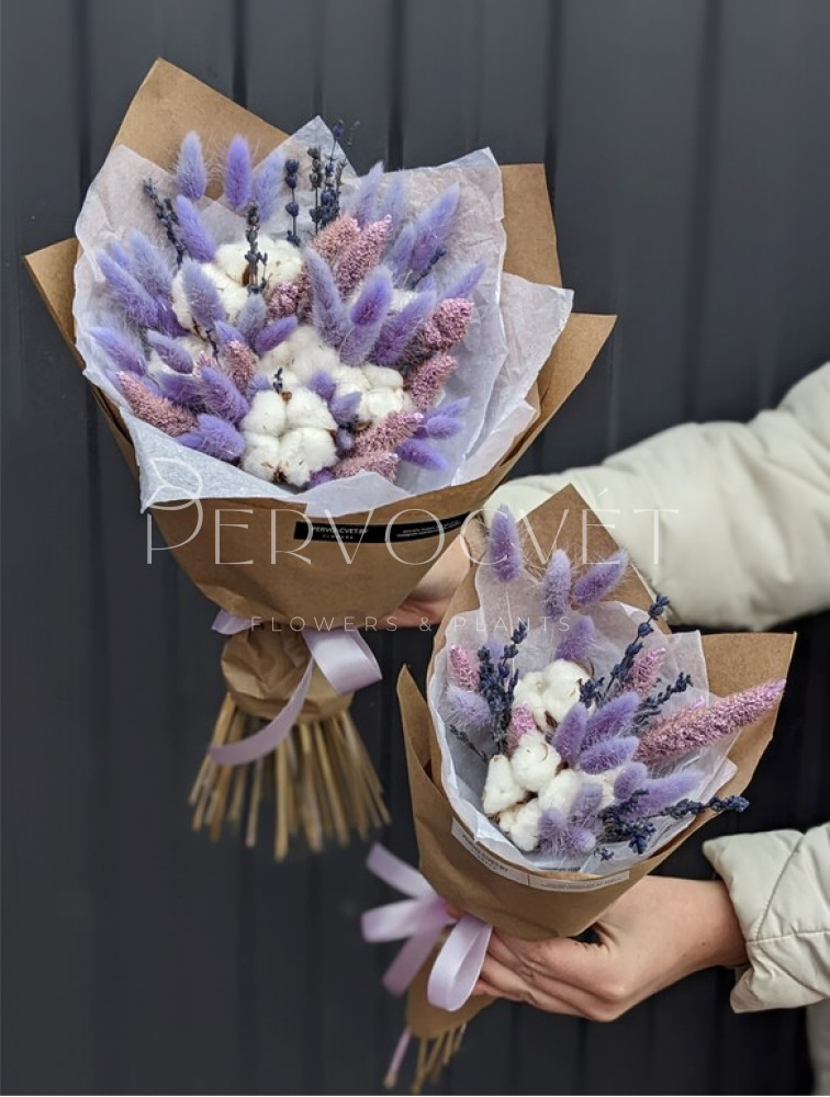 Нежный букет из сухоцветов в сиреневом цвете, со стойкой стабилизированной лавандой, лагурусом, сетарией и, конечно, хлопком. Представлен в двух вариантах: как букет-комплимент и букет среднего стандартного размера.