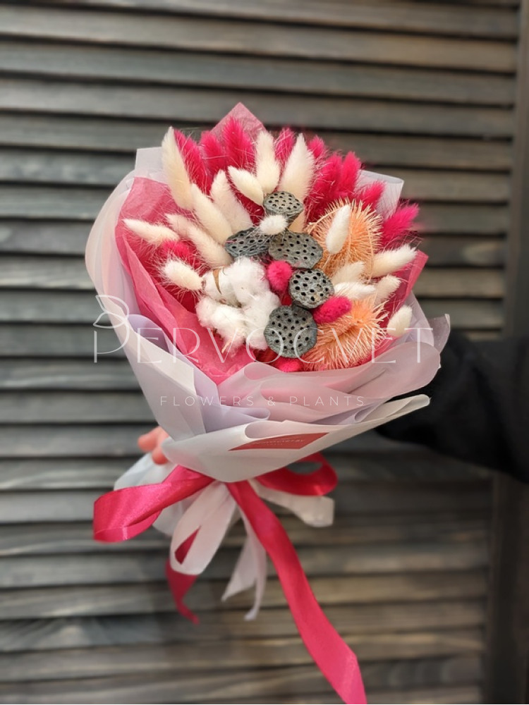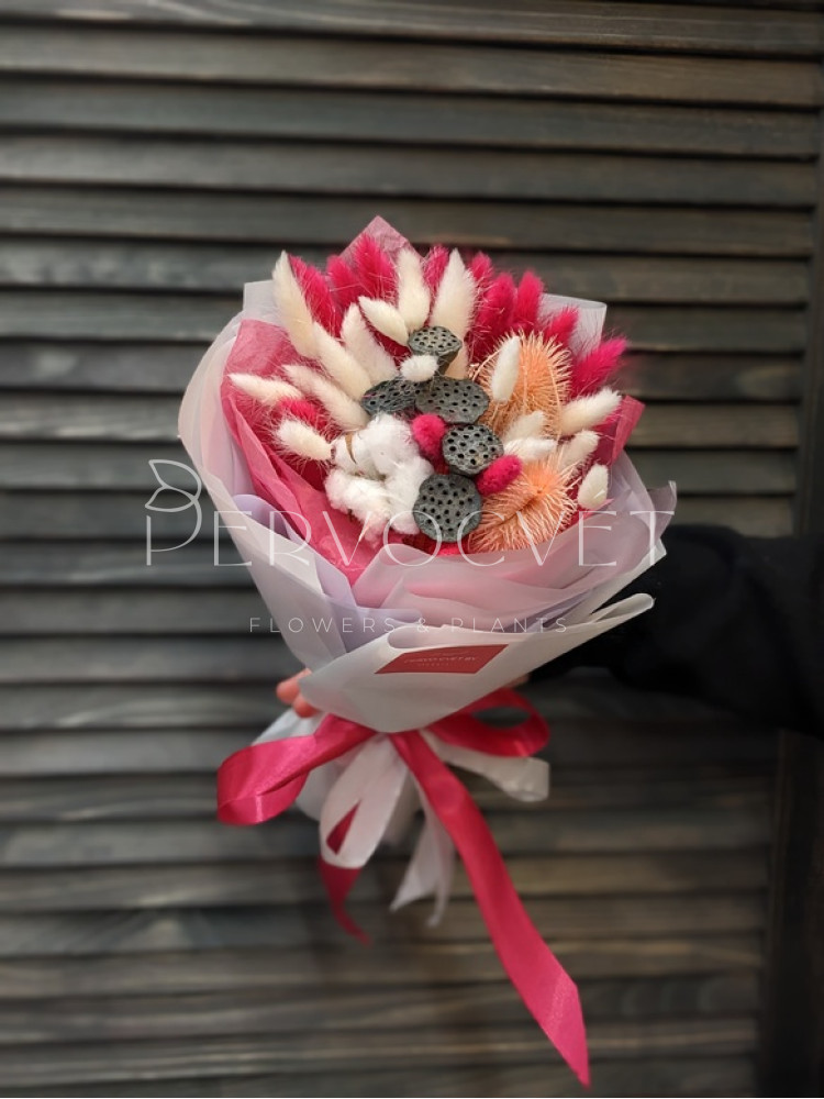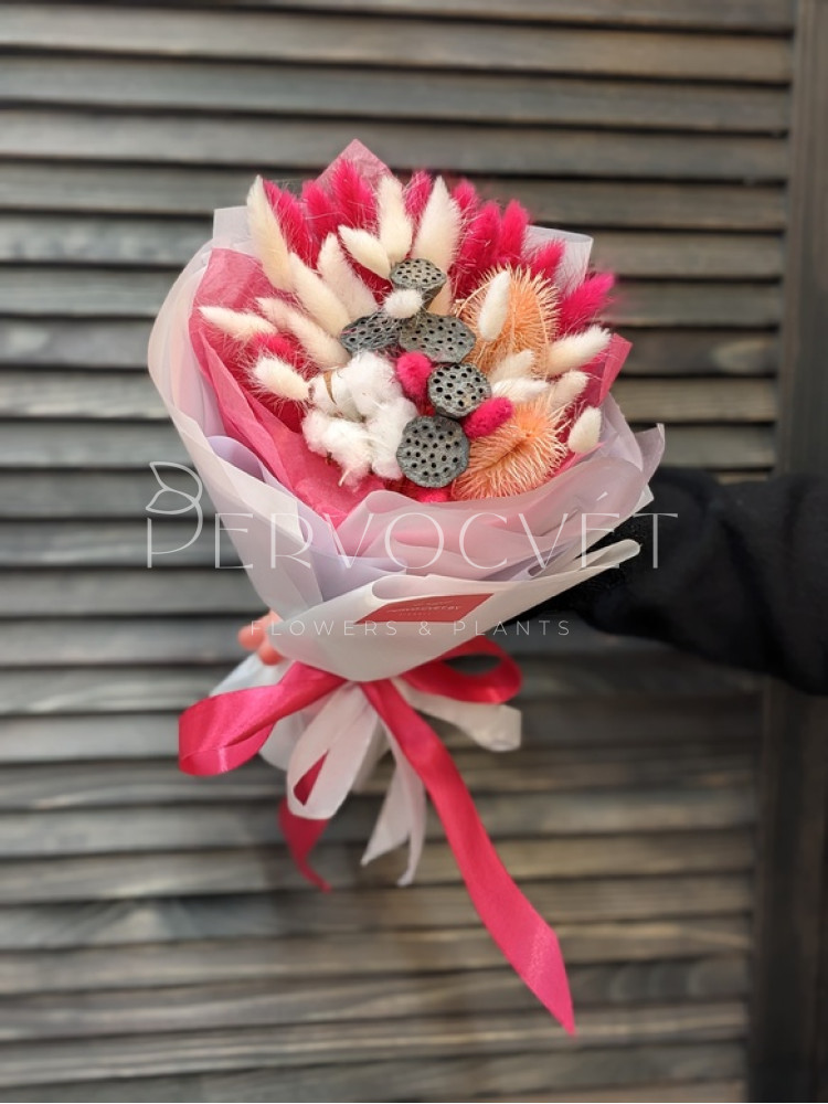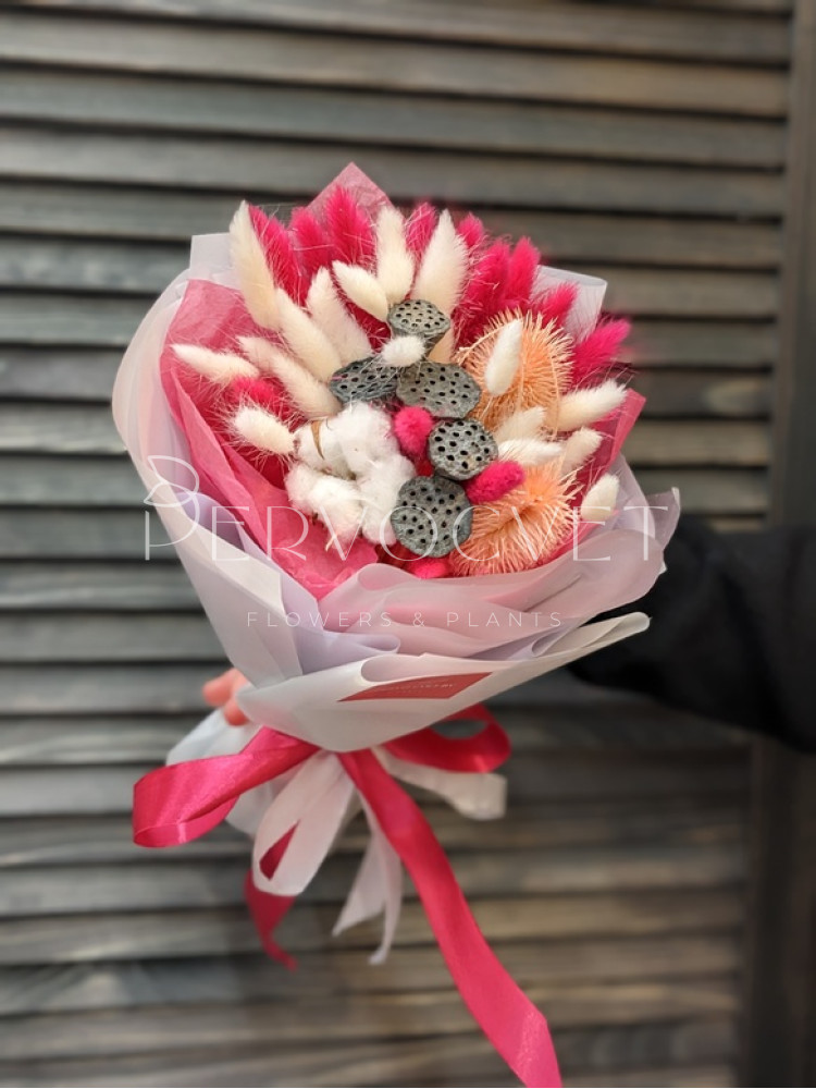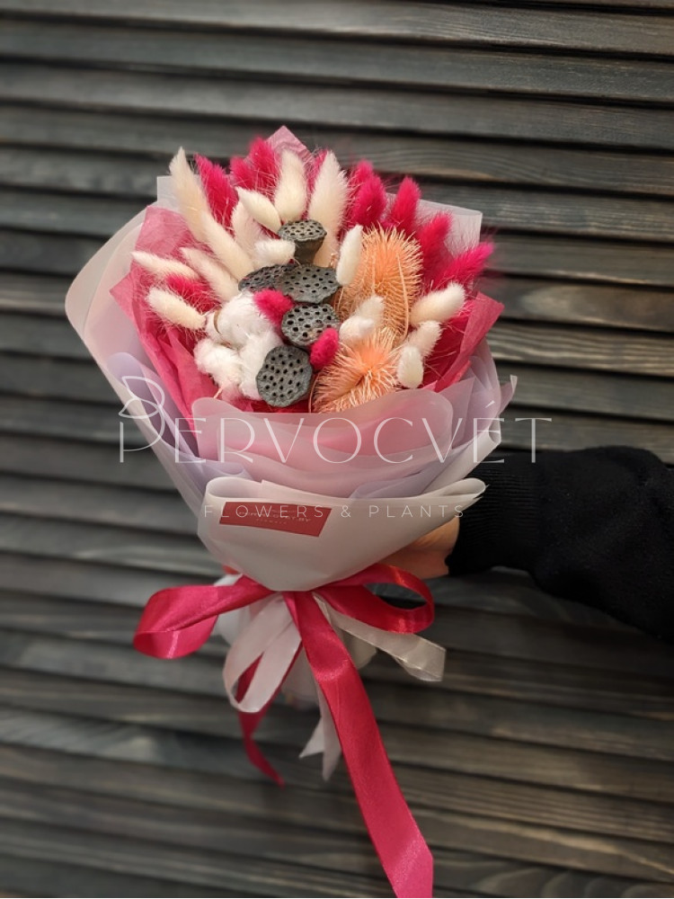 Милый и нежный букет в розовой гамме с высушенными коробочками лотоса в пышной упаковке!