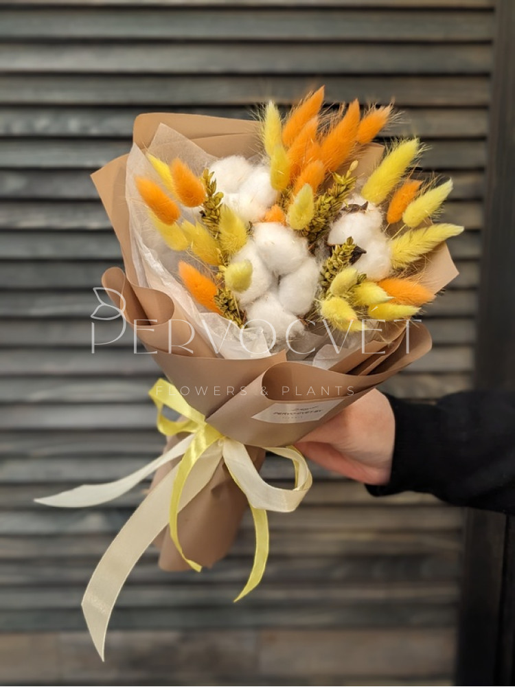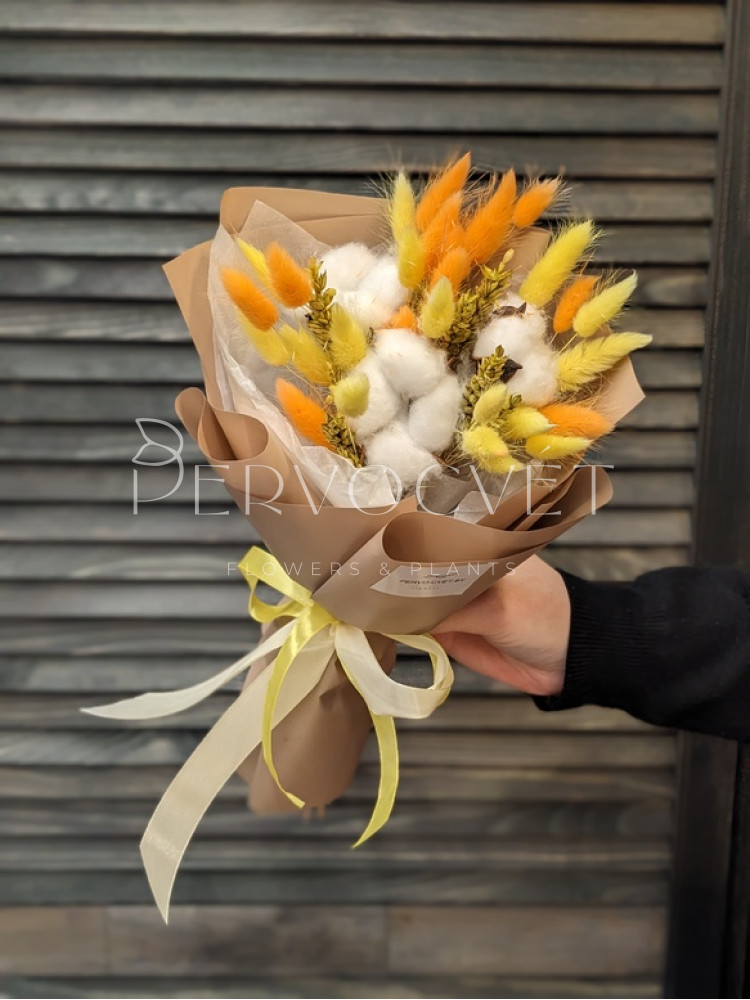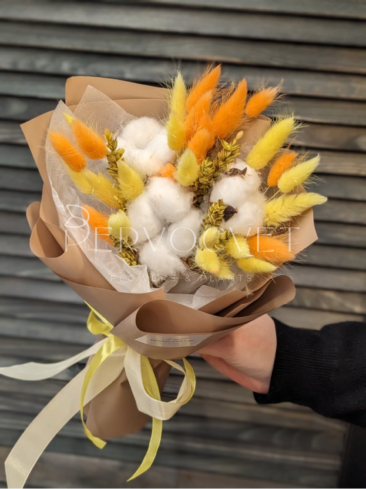 Яркий и игривый букет в желто-оранжевом цвете: с хлопком, зеленым тритикумом и пушистым двуцветным лагурусом в пышной упаковке!
