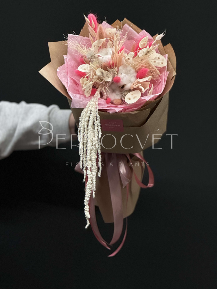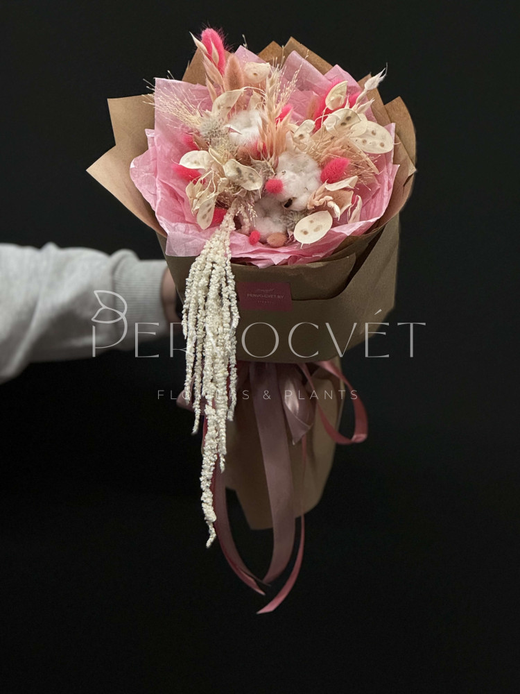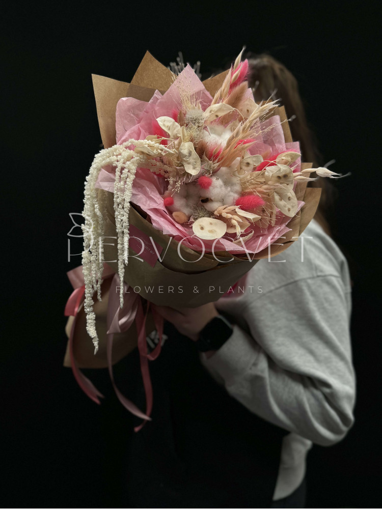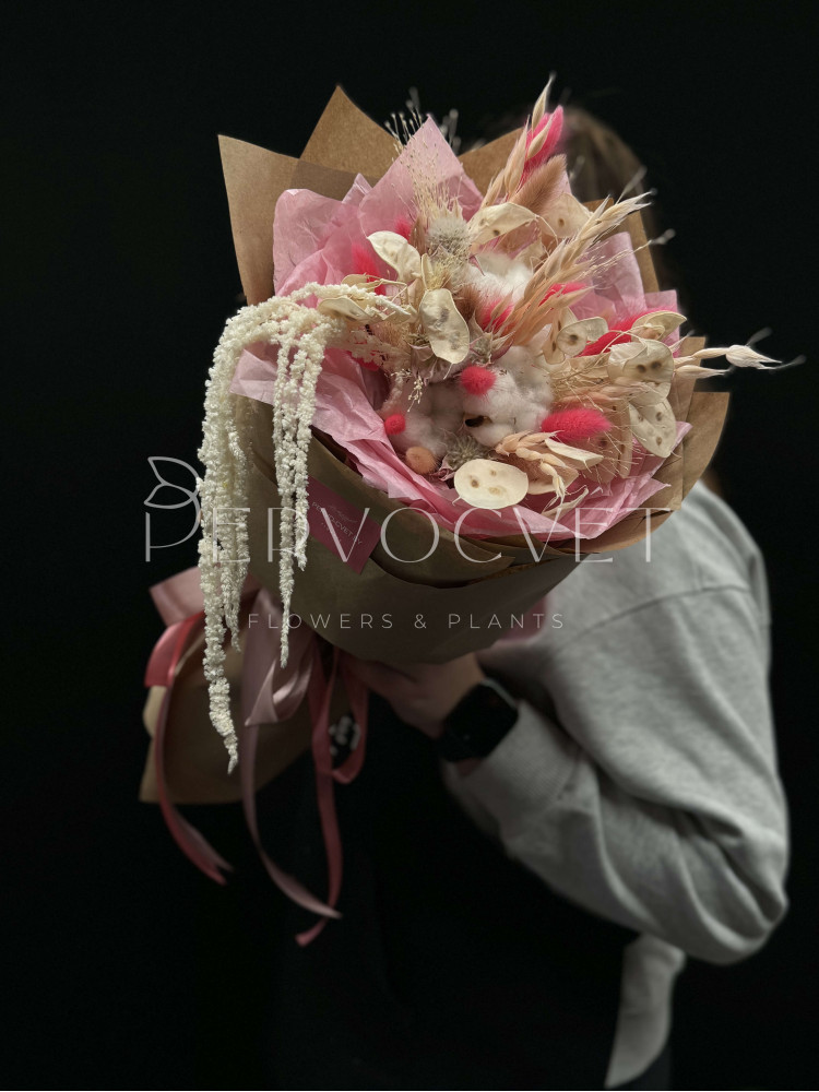 Яркий и оригинальный букет с натуральным хлопком, лагурусом, злаками местных и импортных сухоцветов, с ниспадающим амарантом в пышной, экологичной упаковке!