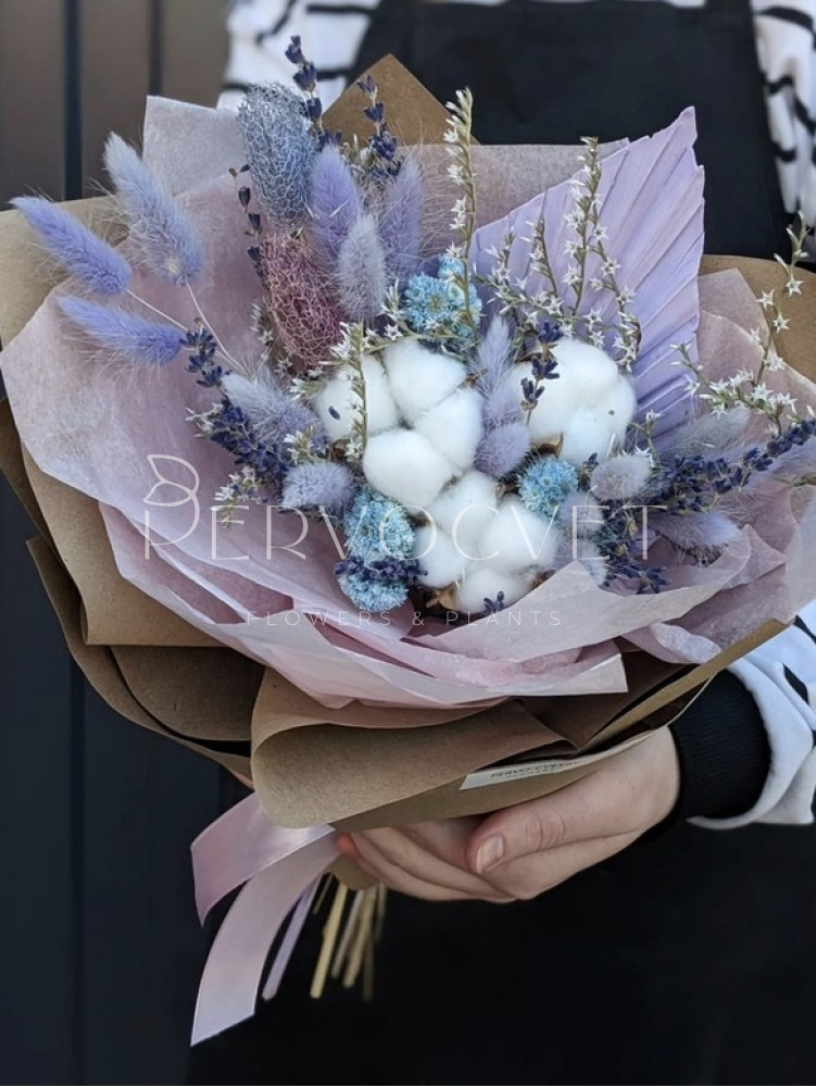 Натуральный букет в сине-голубом оттенке с белым хлопком - пышный авторский букет из сухоцветов с пушистым лагурус, пальмовым крашеный листом, местным кермеком и экбалиумом, цветами анафалиса в голубом оттенке и лавандой!