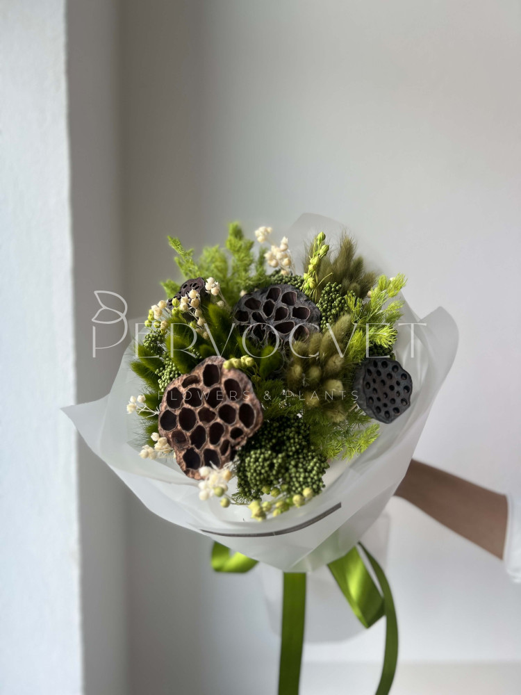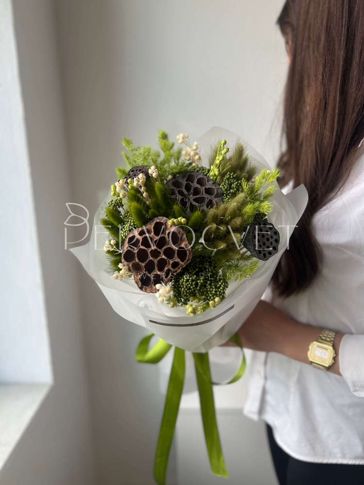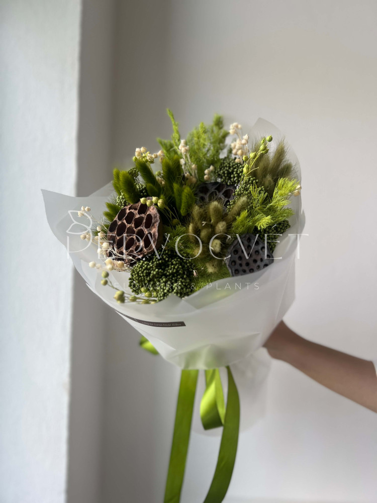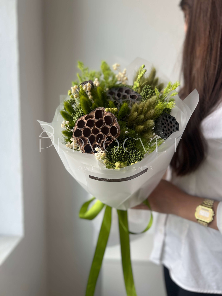 Зеленый успокаивающий оттенок с коробочками лотоса и зелеными злаками: колоски лагуруса, озотамнус, лен и аспарагус. Букет с интересными фактурами и в редких оттенках ! Подойдет для поздравления подруги, коллеги или мамы. Идеально будет смотреться в интерьере в красивой уникальной вазе !