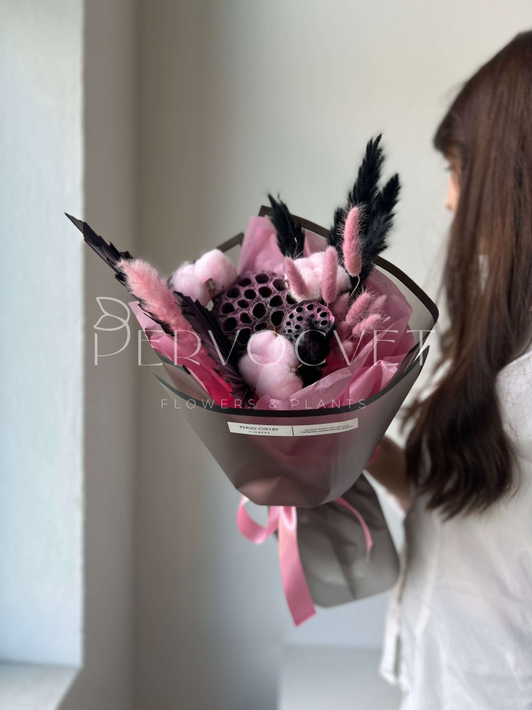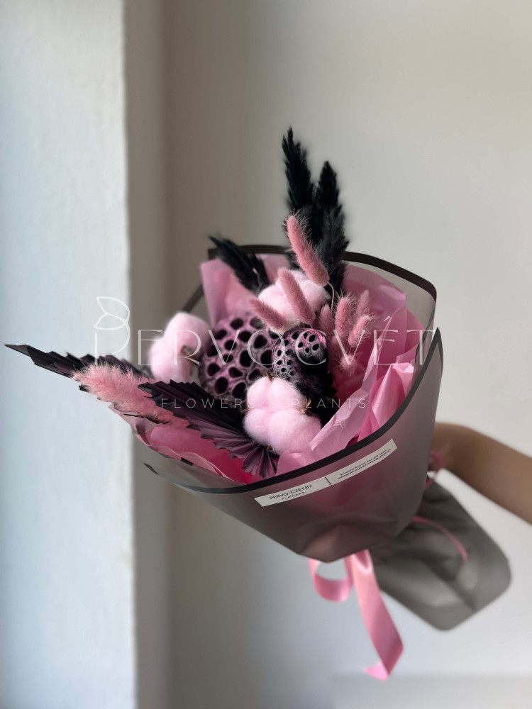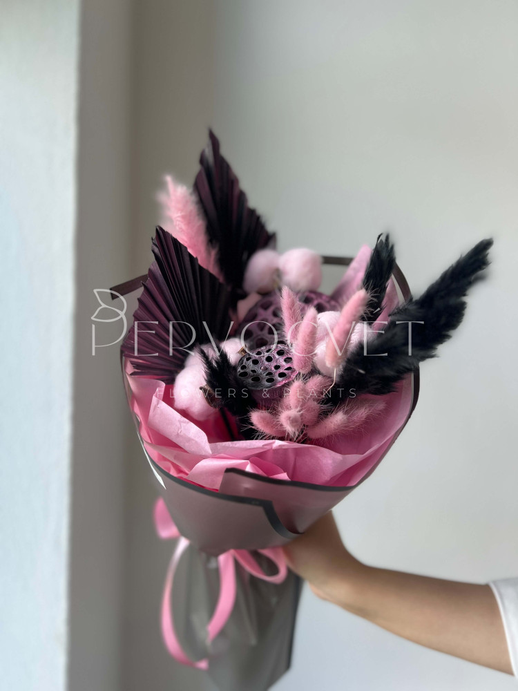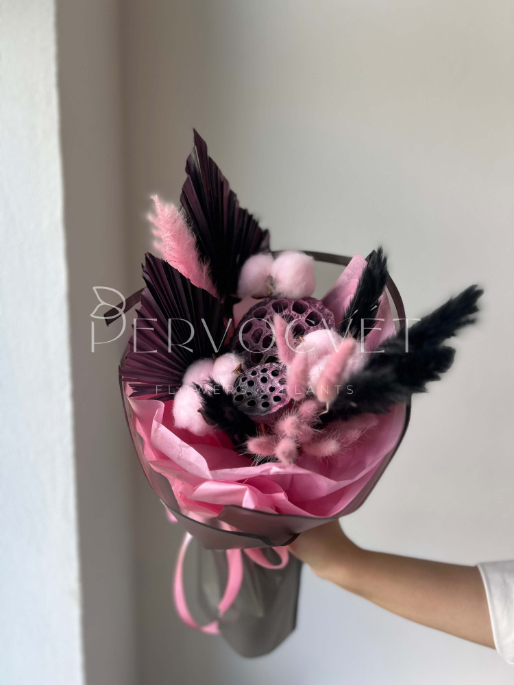 Красивая композиция в уже классических оттенках: розовый и черный! Лотосы и пальмовые листья, злаки и крашеные травы. Фактуры и милый состав в акцентных оттенках для подарка без повода.