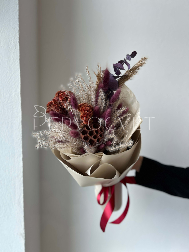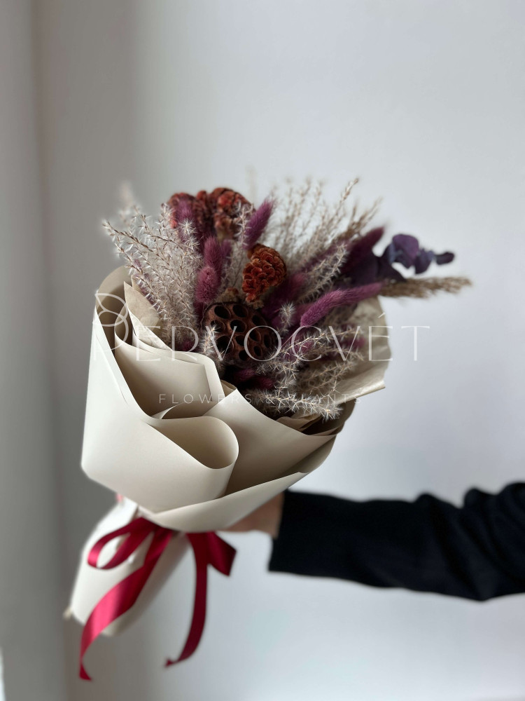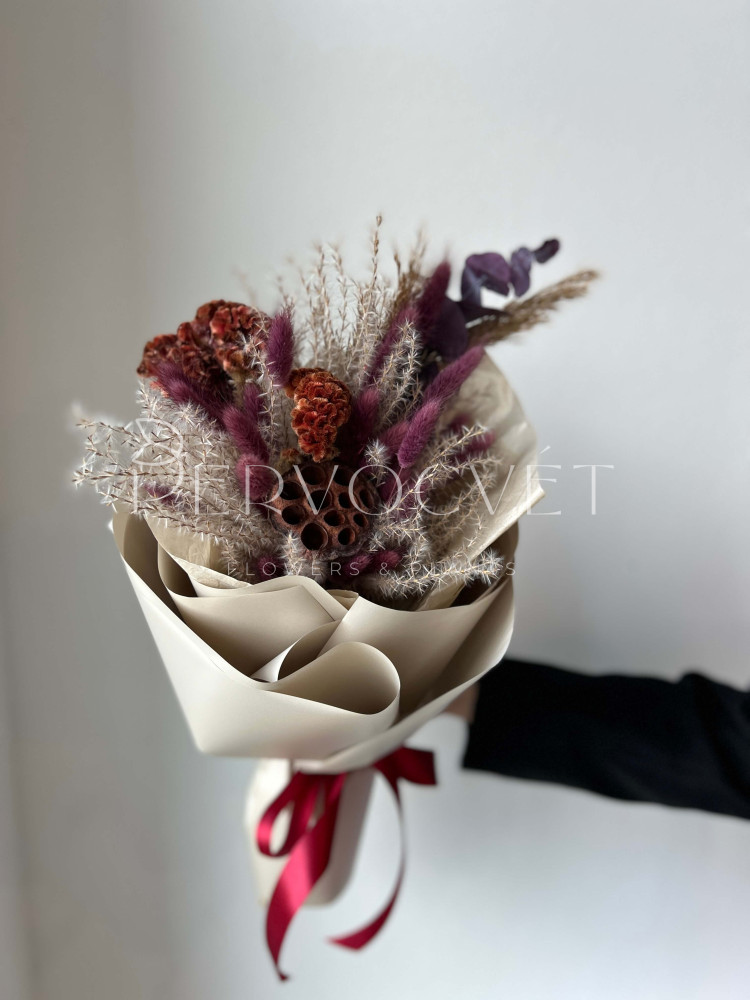 состав: лотос крупный 1, лагурус 2, целозия 2, камыш 1, эвкалипт стабилизированный 1