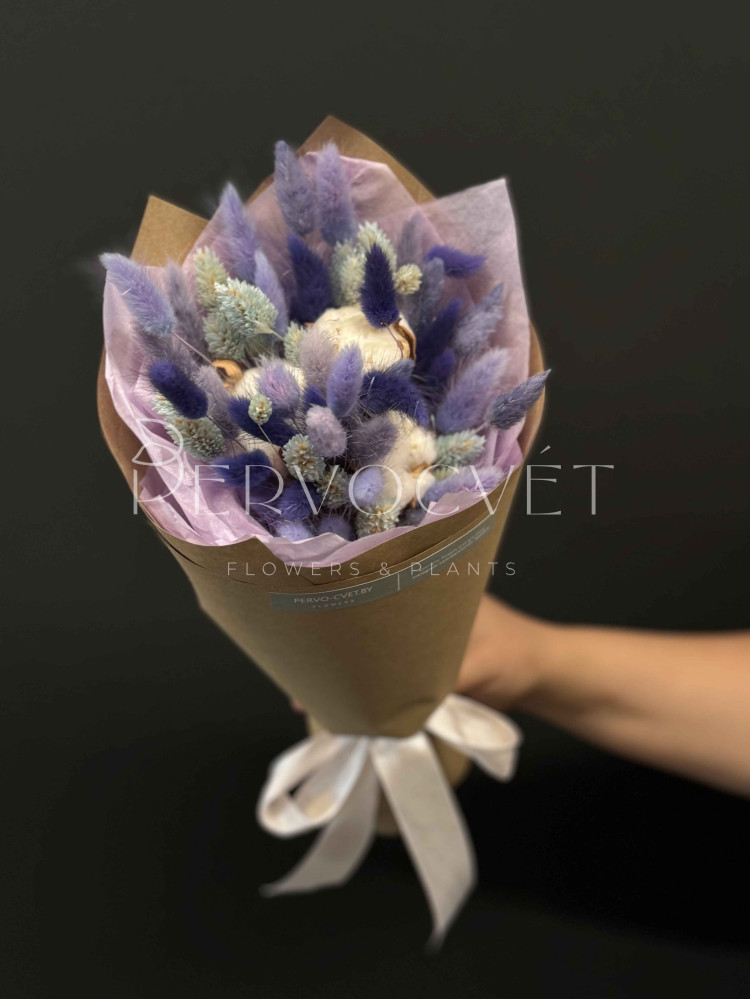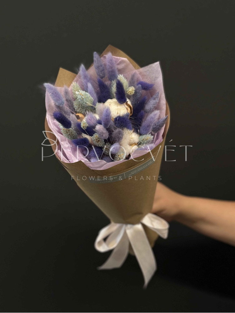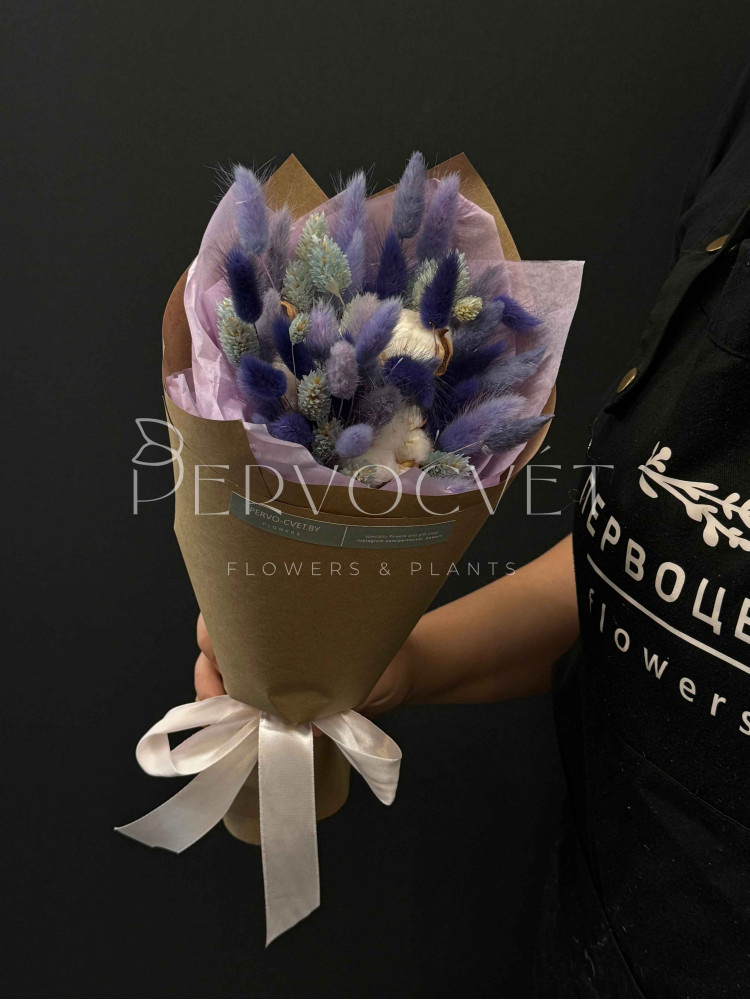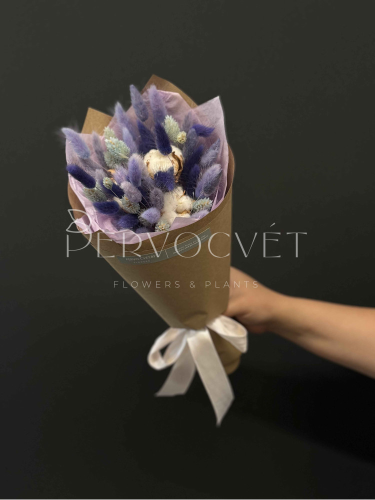 Букетик из сухоцветов в сиреневых оттенках, с цветками хлопка, злаками колосков фалариса и пушистого лагуруса двух оттенков. Красивый набор для вазочки в любой интерьер, приятный комплимент, который будет сохранять всю свою красоту 5 и более лет.