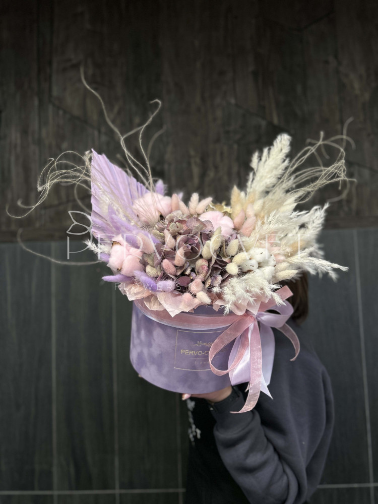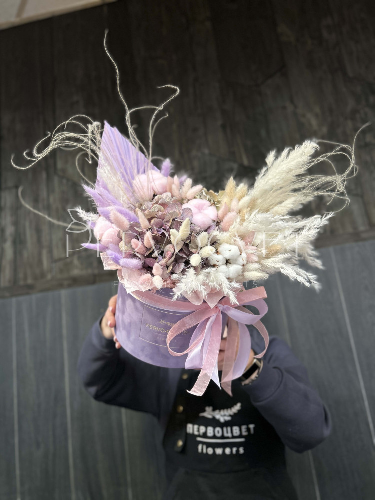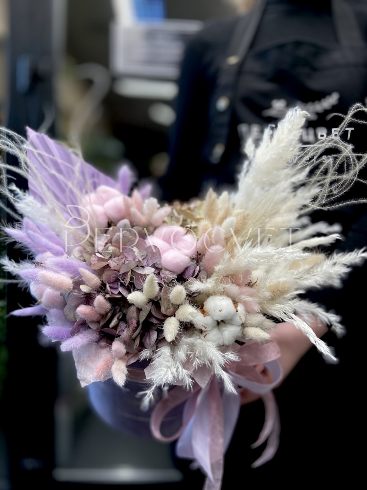 Динамичная композиция с осенней гортензией, коробочками хлопка и пушистым лагурусом, а за настроение и подвижность отвечает воздушная стипа, острый пальмовый лист и пампасная трава! Такая композиция точно не наскучит!