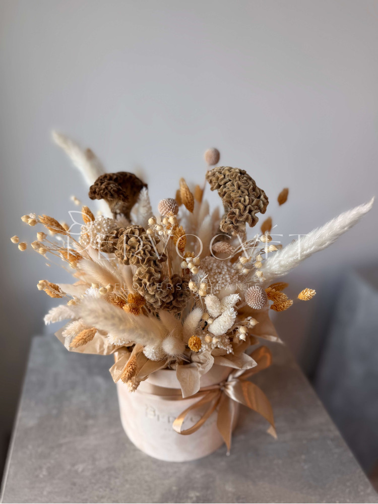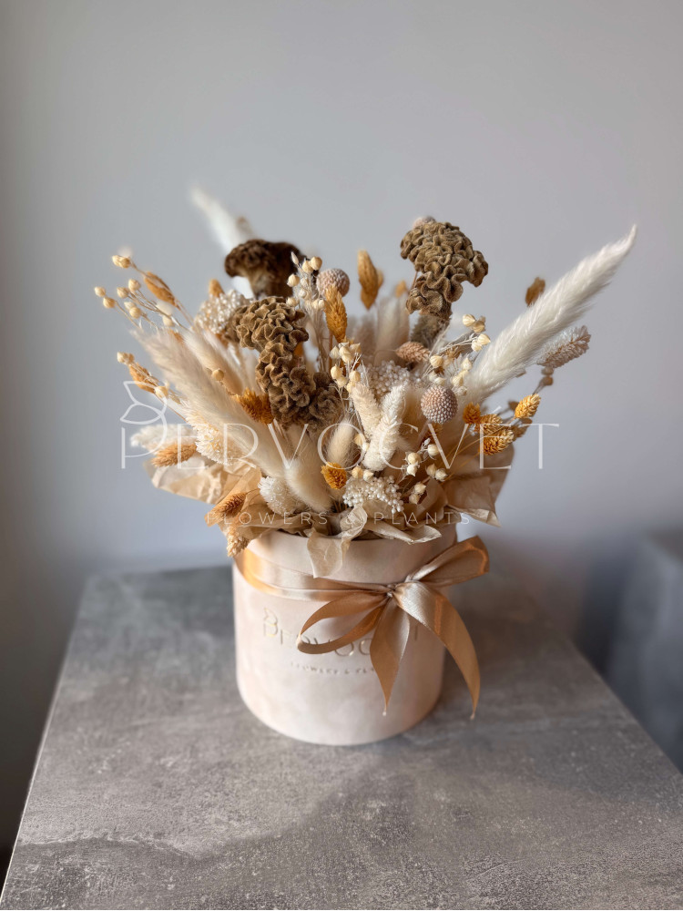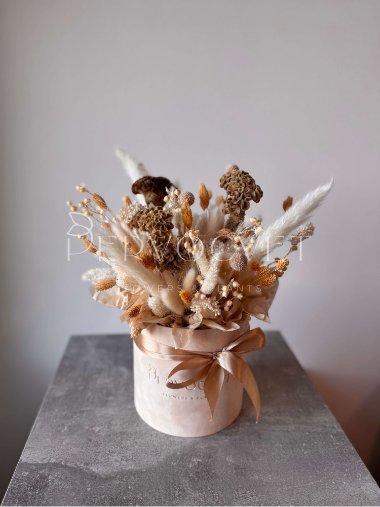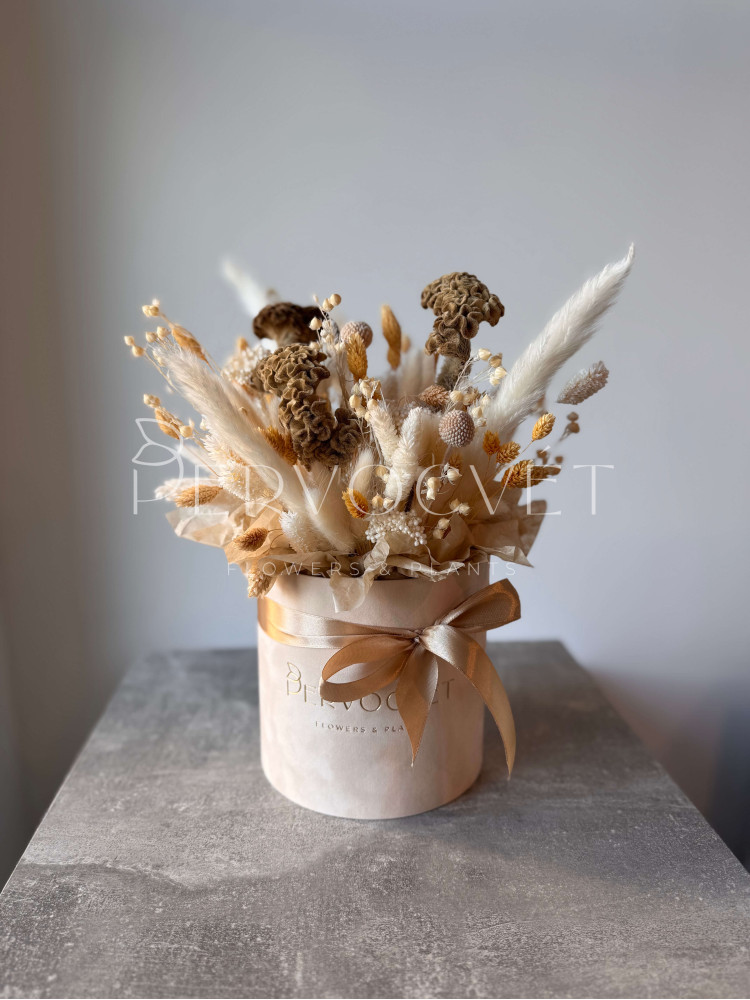Нежные кремово-розовые оттенки натуральных сухоцветов. Композиция в бархатной коробке с уникальной целозией - идеальный подарок, и впишется в любой интерьер. А главное - будет напоминать о вас!