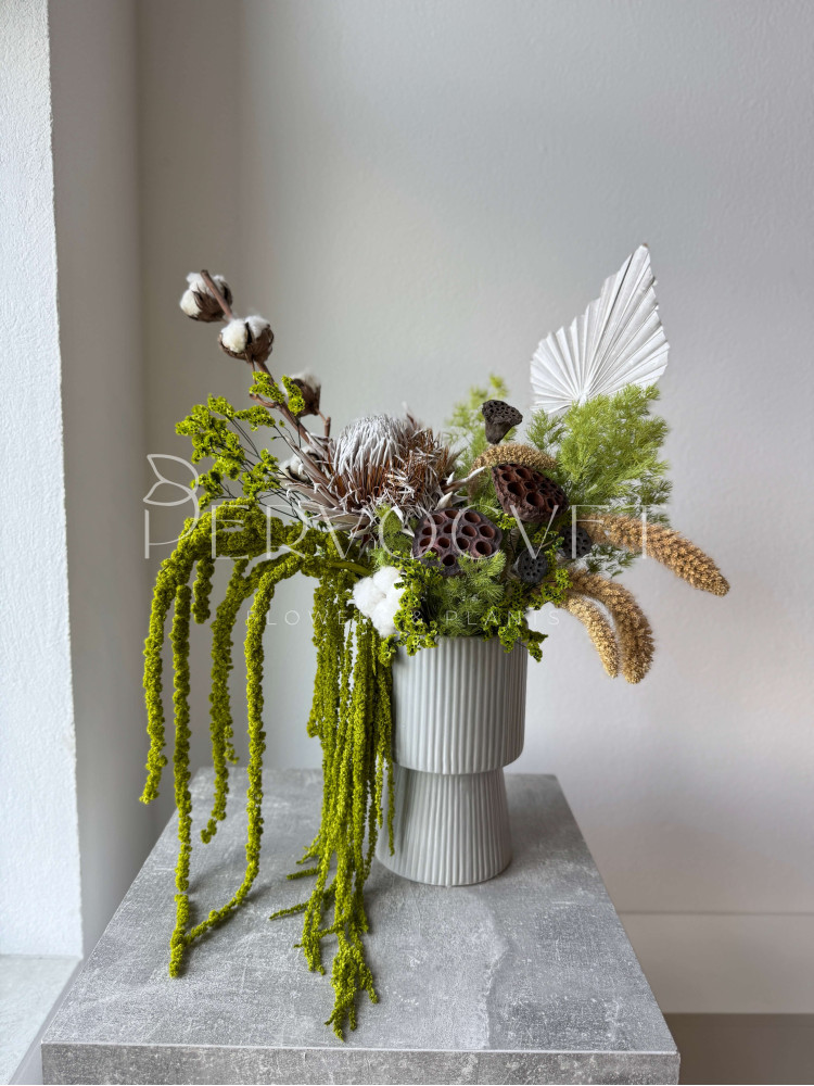 Лесная интерьерная композиция, в природных оттенках натуральных сухоцветов, с добавлением зеленых окрашенных стабилизированных цветов. Идеально для стильного интерьера с минималистичным декором, где эта композиция будет приковывать внимание к зоне, которую так необходимо выделить. Или композиция может стать отличным подарком для квартиры близкого человека, в таком случае стоит добавить открытку с приятными словами, ведь композиция будет напоминать о вас каждый день!