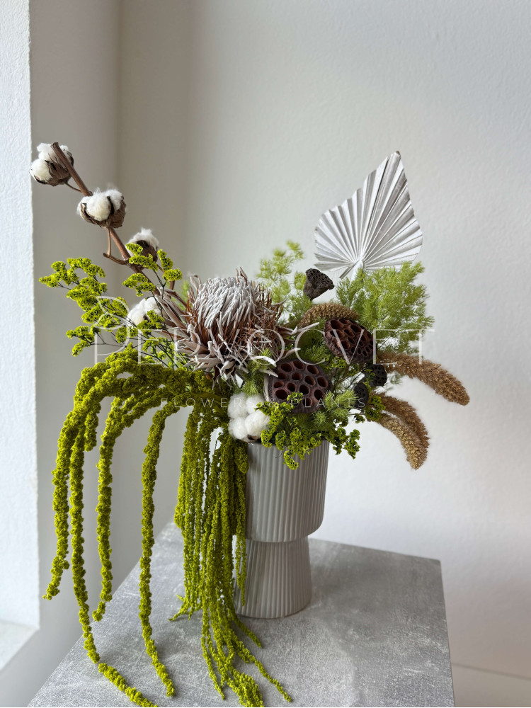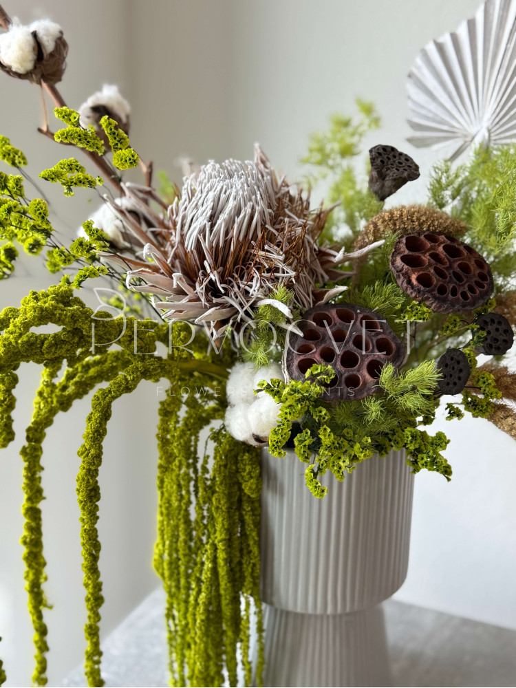 состав: протея сухоцвет 1, лотом большой 2, лотос малый 5, хлопок 8, амарант большой 1, амарант малый 1, аспарагус стабилизированный 2, сетария 1, лимониум стабилизированный 2, пальмовый лист 1