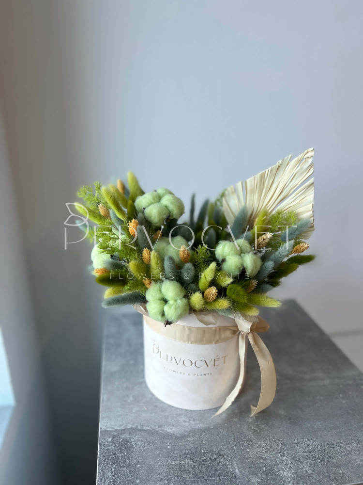 состав: хлопок крашеный 5, фаларис 2, лагурус 7, аспарагус стабилизированный 1, пальмовый лист 1