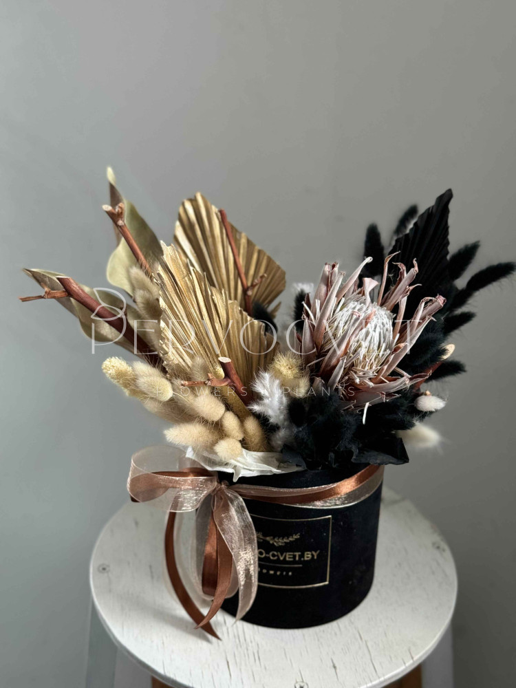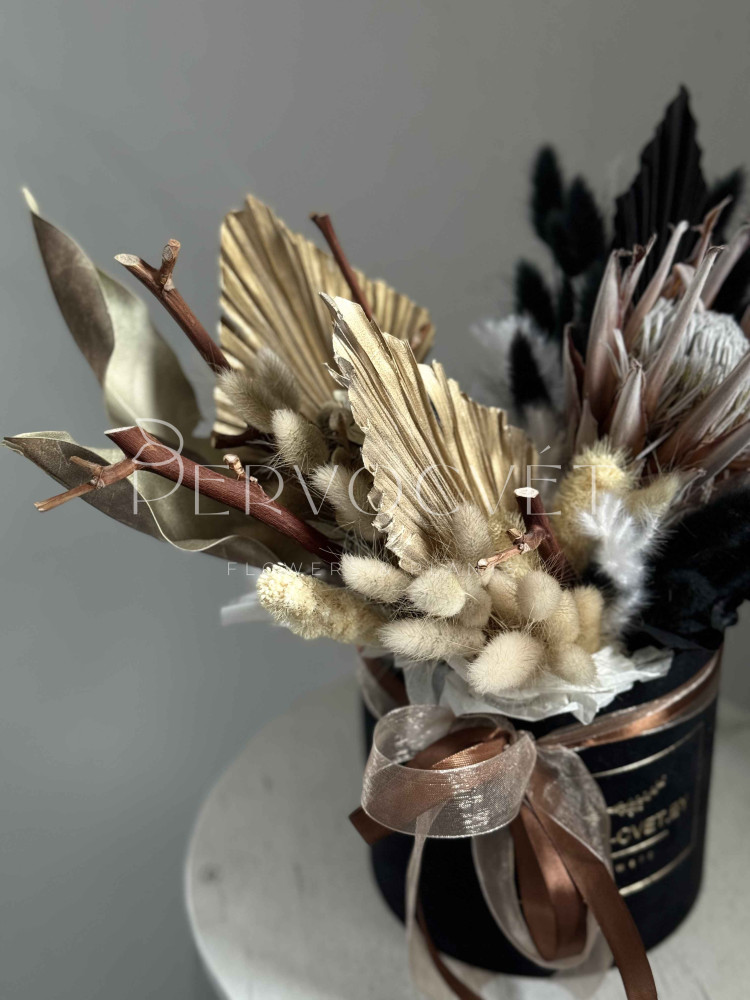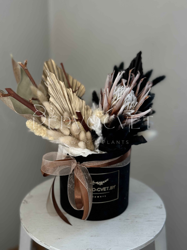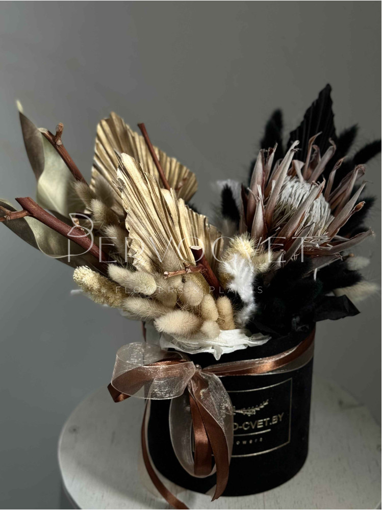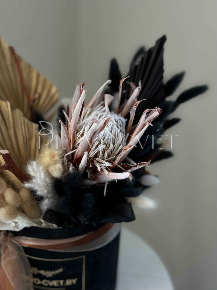 Натуральный и черный цвет в дуо-композиции: два оттенка лагуруса, экзотическая протея и пальмовые листья. Экзотические и местные сухоцветы в смелом и интересном сочетании!