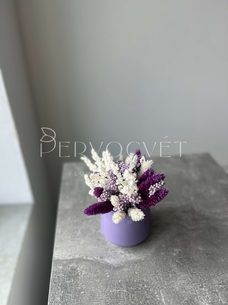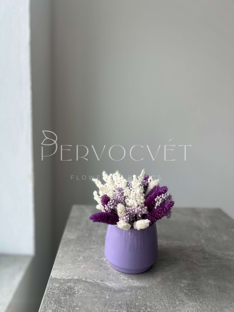 Маленький вечный комплимент, который станет прекрасным дополнением к подарку! Сухоцветы в красивом сиреневом оттенке в керамическом кашпо.